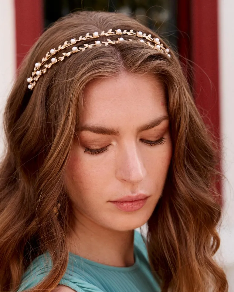 Bandeau double de couleur or avec perles et détails de feuilles brillantes. Un accessoire délicat et élégant pour les grandes occasions.