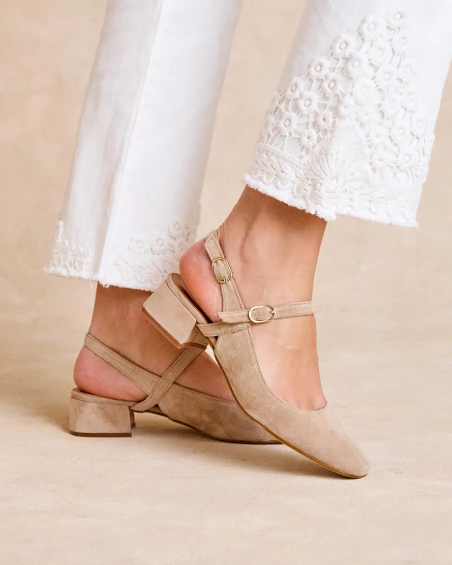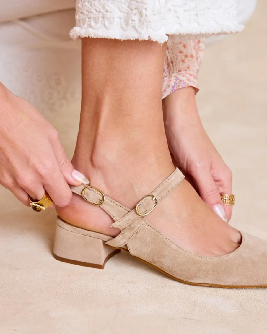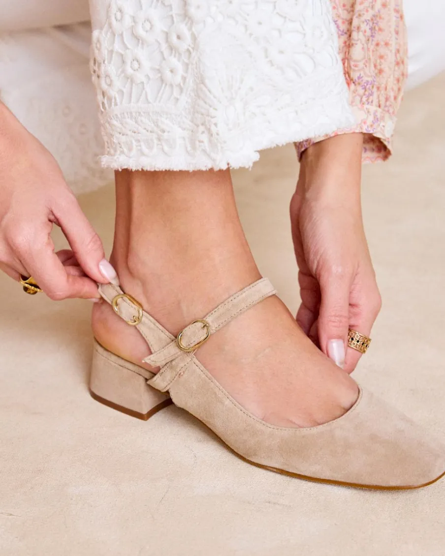 Ballerines escarpins arrière de couleur sable. Fermeture par sangle réglable avec boucles. Bout légèrement carré. Encolure arrondie.