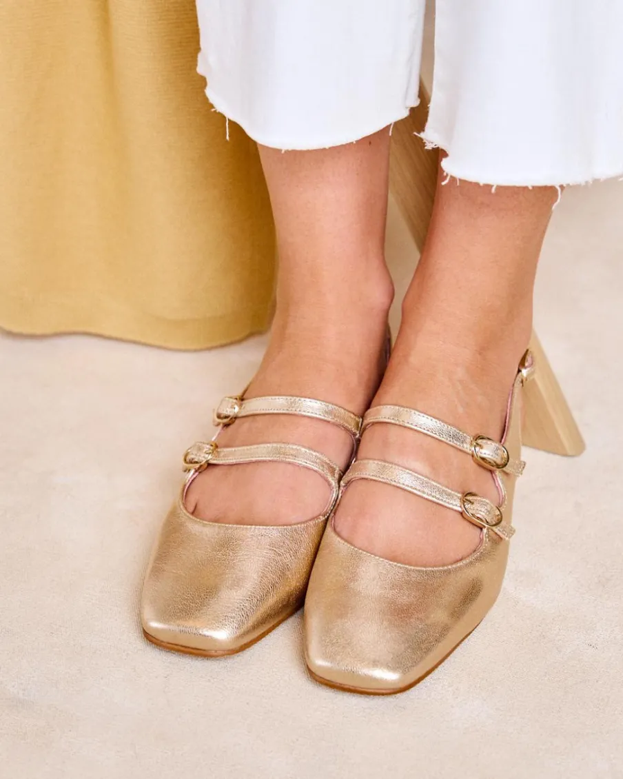 Escarpins dorés Mary Jane. Fermeture à double à lanière réglable avec boucles. Bout légèrement carré. Encolure arrondie. Une chaussure stylée et élégante pour un usage quotidien.
