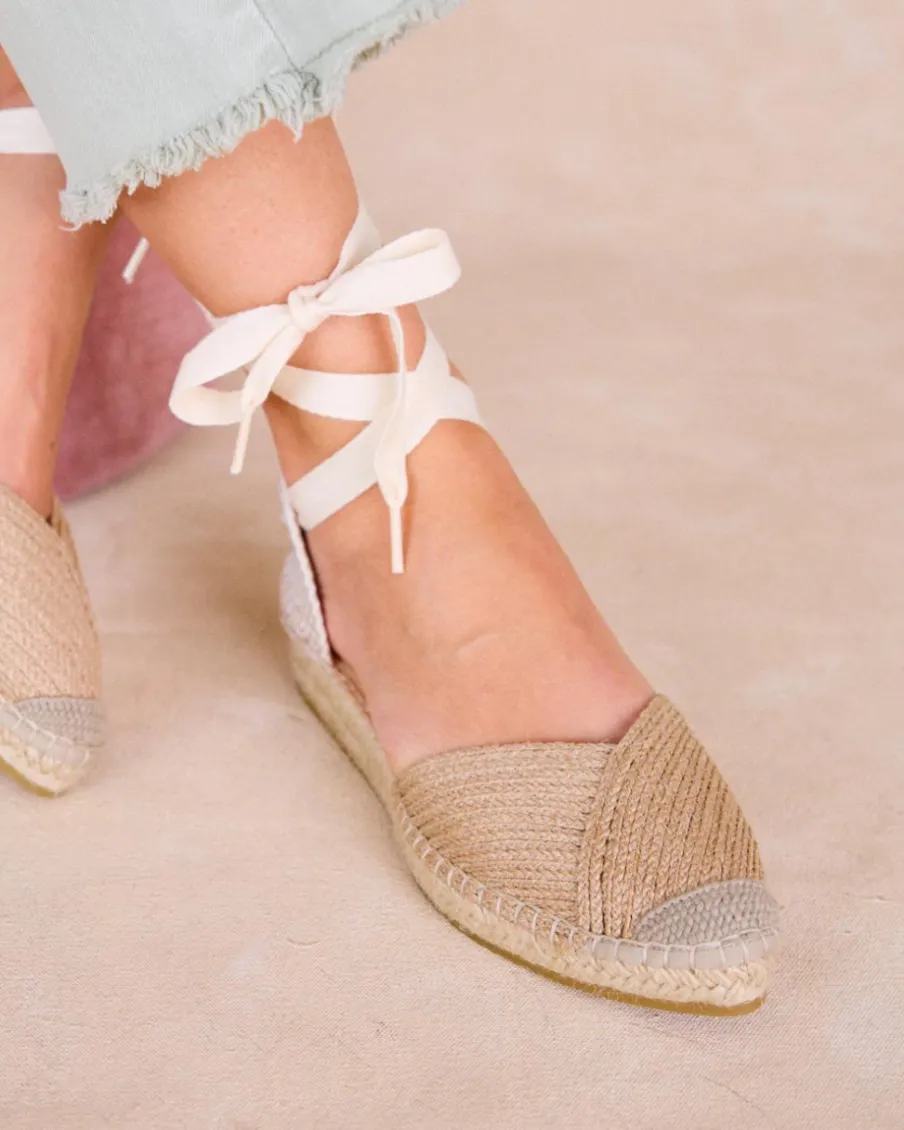 Espadrilles beiges au design classique et bretelles à nouer à la cheville. Leur finition en jute et leur bout fermé en font les chaussures parfaites pour un look frais et naturel.