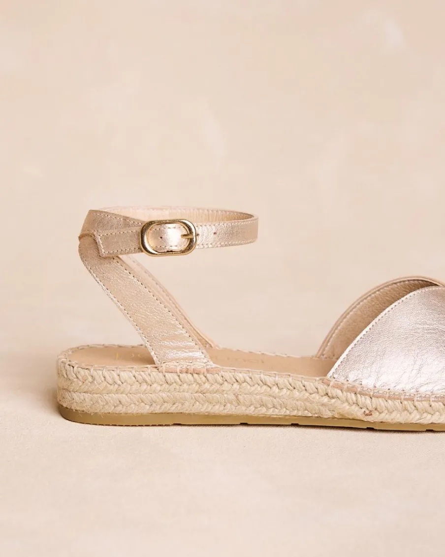 Espadrille de couleur argentée avec bride de cheville réglable. Design léger, confortable et polyvalent pour les looks d’été.