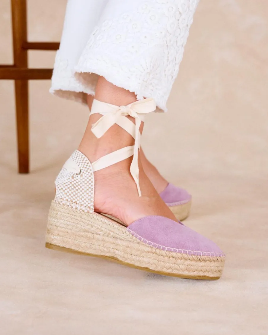 Espadrille plateforme lilas. Pointe légèrement pointue. Support de cheville avec brides à la cheville et encolure en cœur. La semelle intérieure est dotée d’un coussinet pour plus de confort.