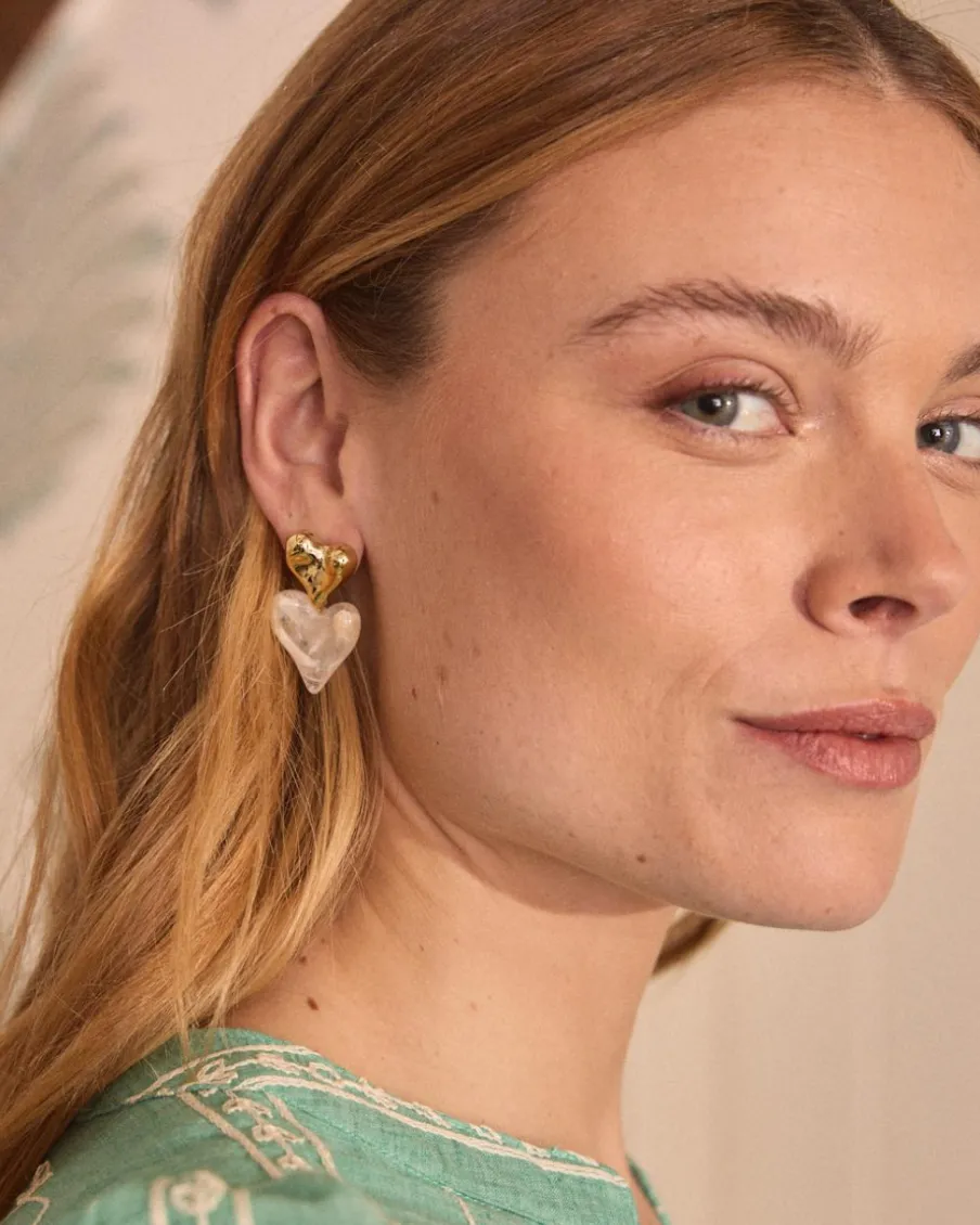 Boucles d’oreilles avec un cœur doré et un pendentif blanc en forme de cœur.