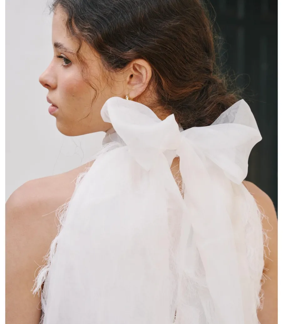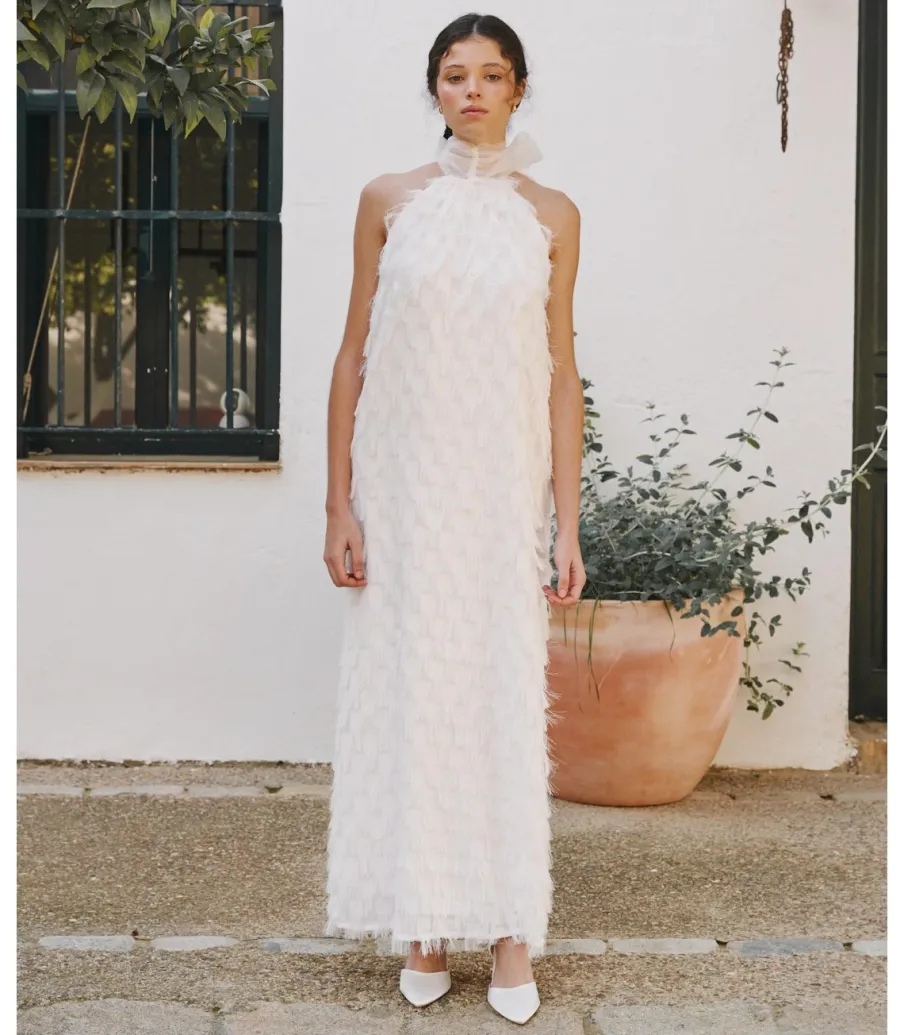 La séduction et l’amour intense de cette fleur donnent forme à cette robe blanche à longue mariée , faite d’un tissu délicat avec de petites et fines franges de fils. Col rond en tulle d’où naissent deux longues bretelles pour nouer au cou et laisser retomber l’excédent du nœud. Conception sans manches. Arc au niveau du cou avec lequel faire un beau arc au goût. Robe à coupe droite avec une jupe longue au sol. La robe mariée Dalia comprend une doublure intérieure.