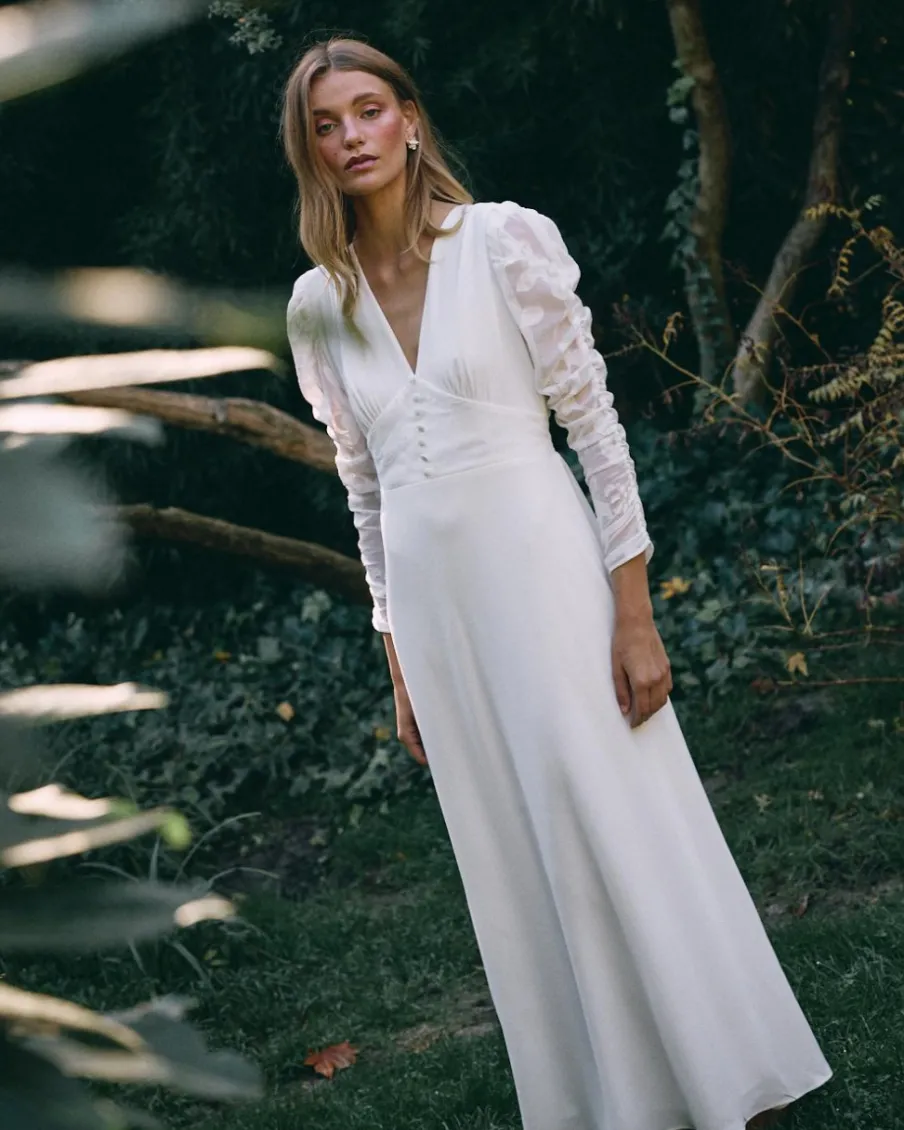La délicatesse et le charme d’une longue robe blanche en tissu léger. Décolleté en V profond agrémenté de boutons subtils sous la poitrine, créant une silhouette féminine. Manches longues bouffantes. La jupe fluide tombe doucement, transformant chaque pas en un mouvement élégant. Ce design capture l’essence de la mariée romantique et rêveuse.