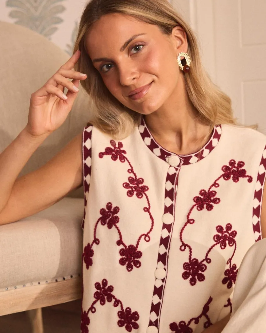Gilet de couleur brute avec détails brodés de couleur carreau. Parfait pour rehausser vos looks de tous les jours.