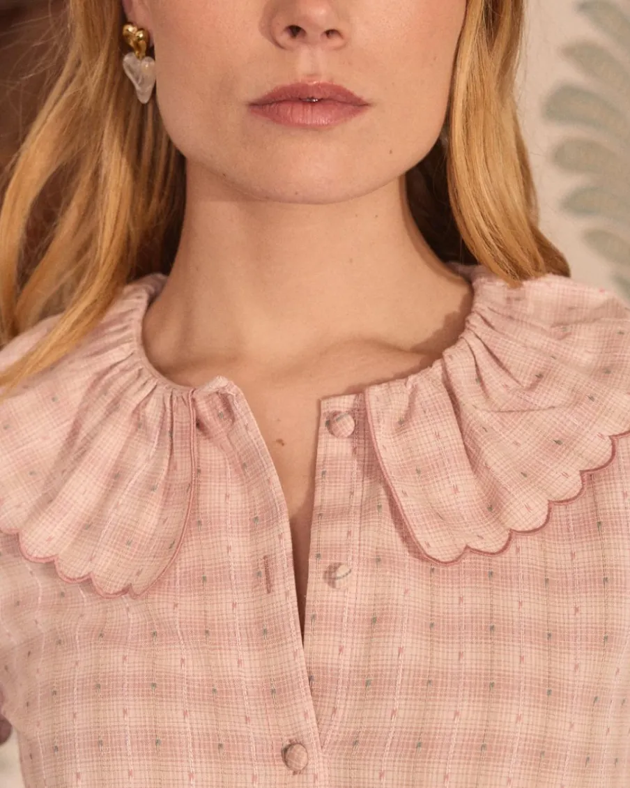 Blouse rose avec imprimer à carreaux subtils, col plastron, manches longues et boutons sur le devant.