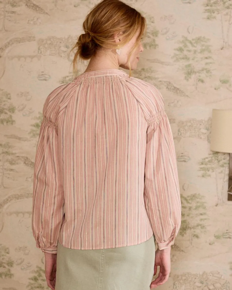 Blouse rose avec rayures en lurex multicolores, rangée de boutons, encolure en V et manches longues
