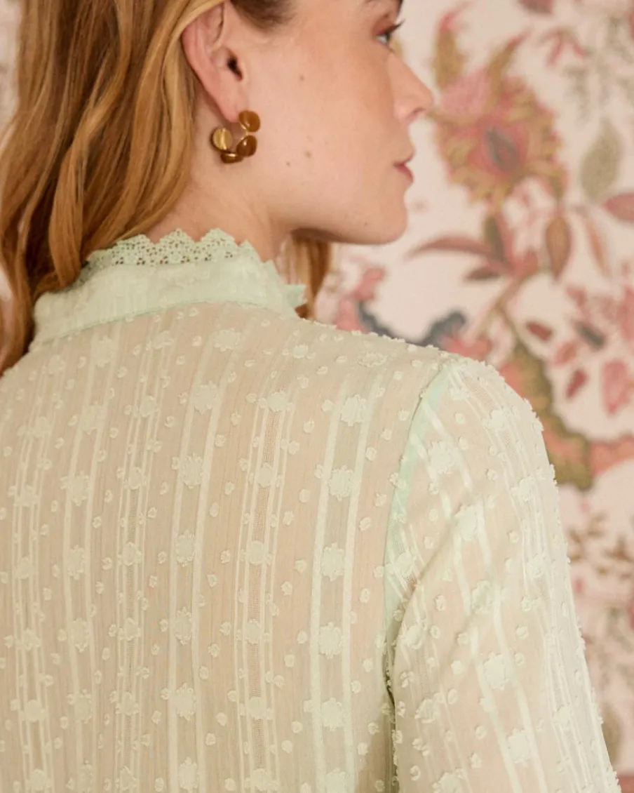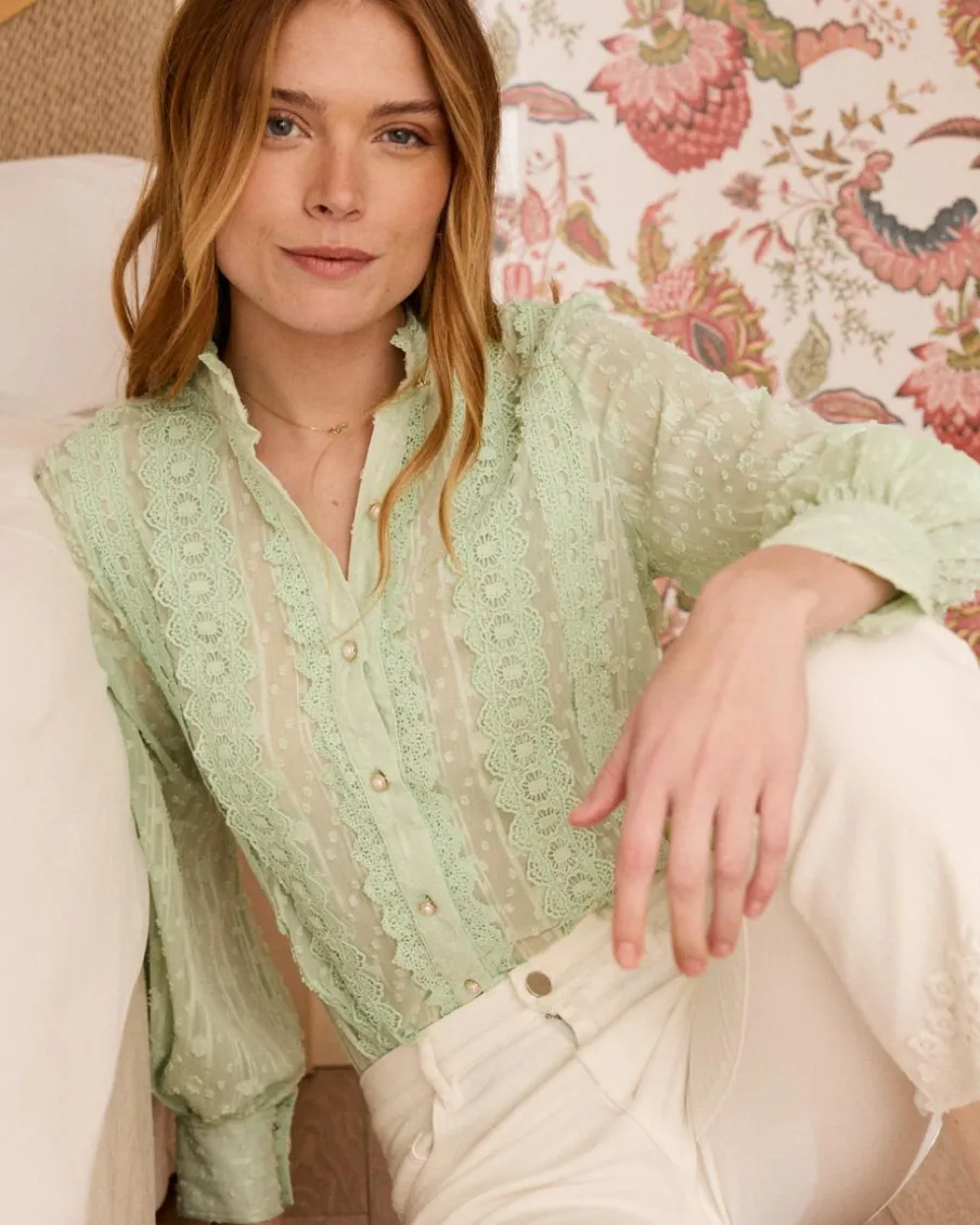 Blouse brodée verte avec rangée de boutons, détail de volants et manches longues.