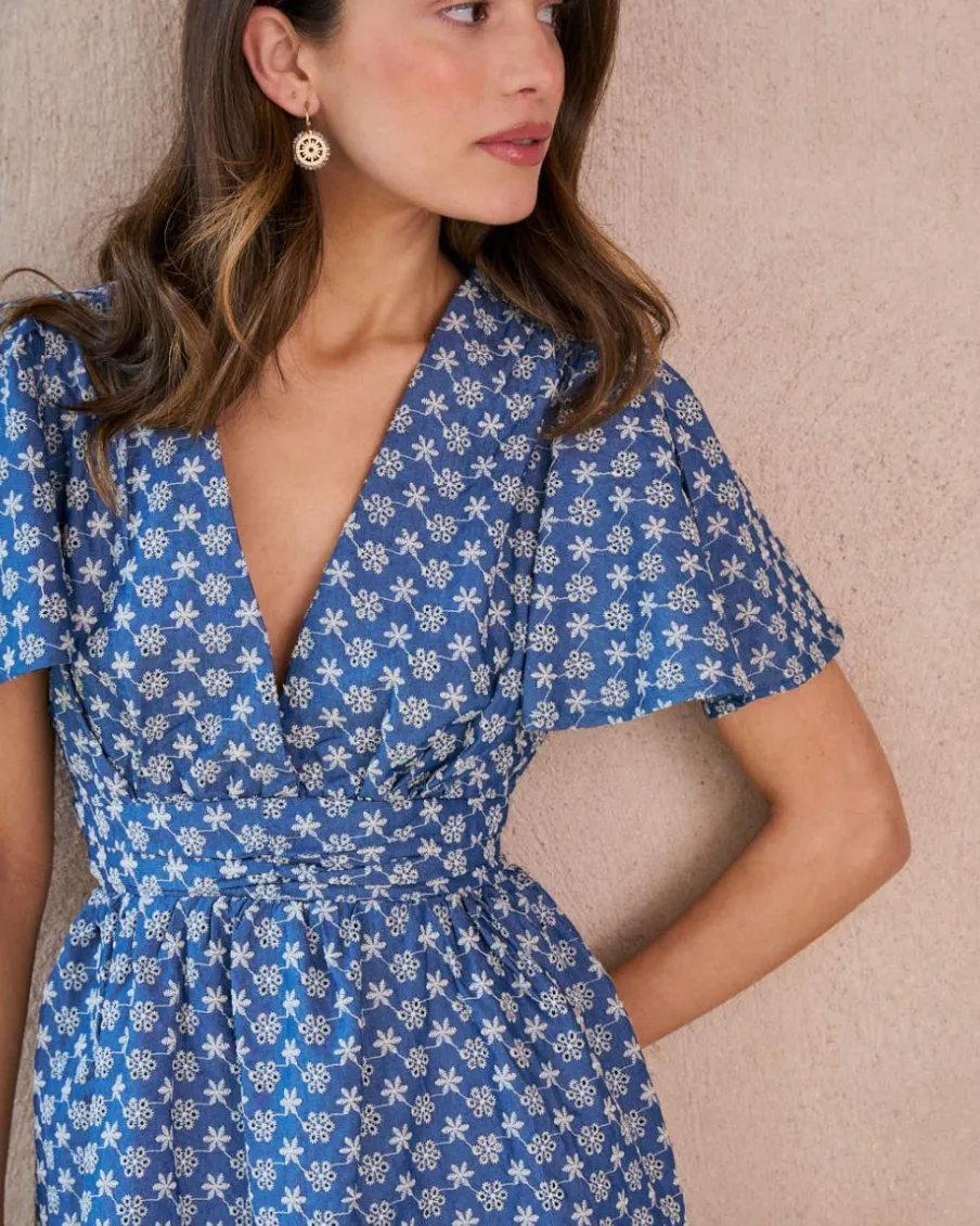 Robe courte dans les tons bleus avec imprimer de fleurs contrastées. Modèle avec une encolure en V, de larges manches courtes et une taille ajustée qui met en valeur la silhouette.