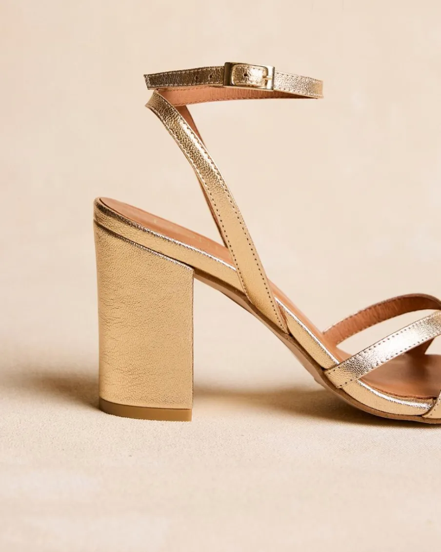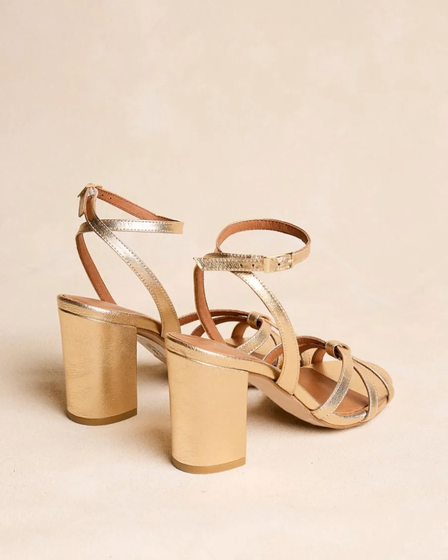 Sandale à talons dorés. Pointe carrée aux coins légèrement arrondis. Encolure avec trois rubans croisés. Fermeture de la cheville par sangle réglable avec boucle carrée. Une chaussure élégante et confortable.