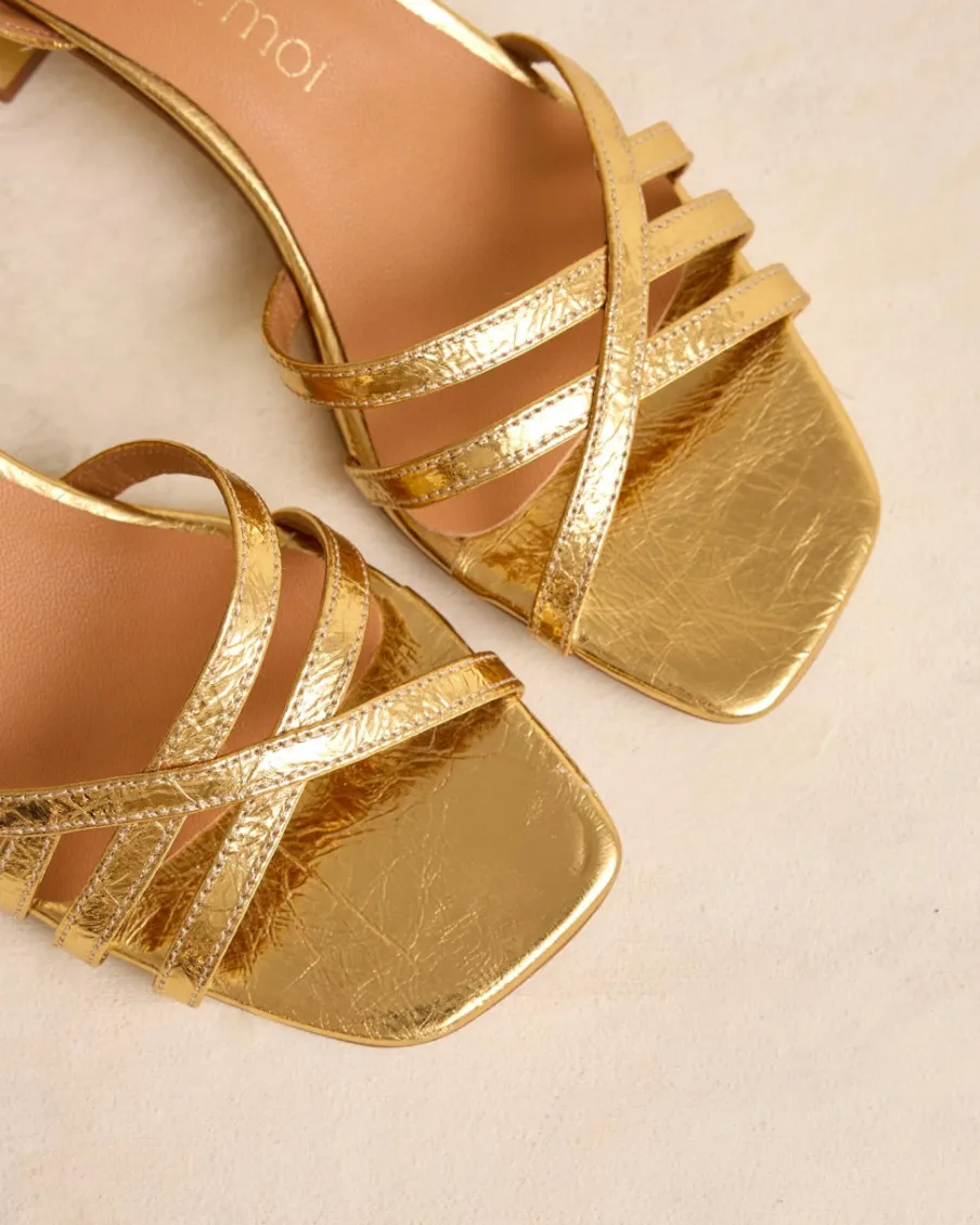 Sandale en cuir métallisé de couleur or. Bout légèrement carré. Bretelles croisées sur le cou-de-pied. Fermeture de la cheville avec bride ton sur ton et boucle pour ajuster la sandale à la cheville. Petit talon carré. Une sandale élégante et confortable.