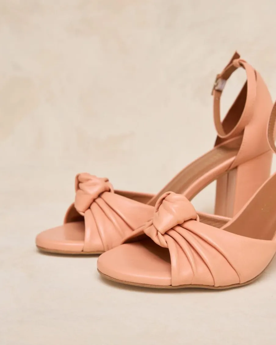 Sandale à talon pêche. Pointe arrondie. Encolure avec détail de nœud au centre. Fermeture de la cheville par sangle réglable avec boucle carrée. Une chaussure élégante et confortable.