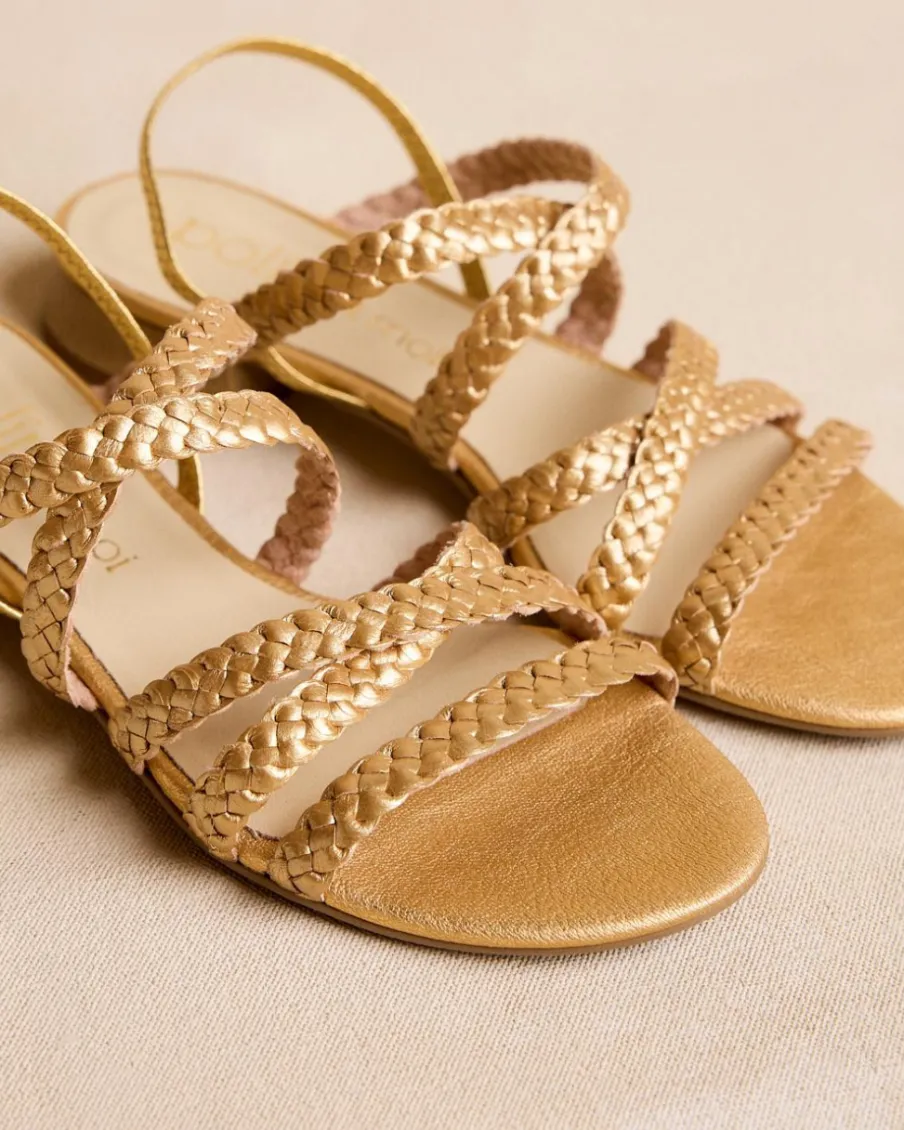 Sandale en cuir tressé doré. Encolure avec rubans tressés croisés en orange, blanc et camel. Talon fermé par une bride en cuir élastique de couleur camel pour un ajustement confortable. Une sandale aux couleurs très spéciales et polyvalentes pour cette saison.