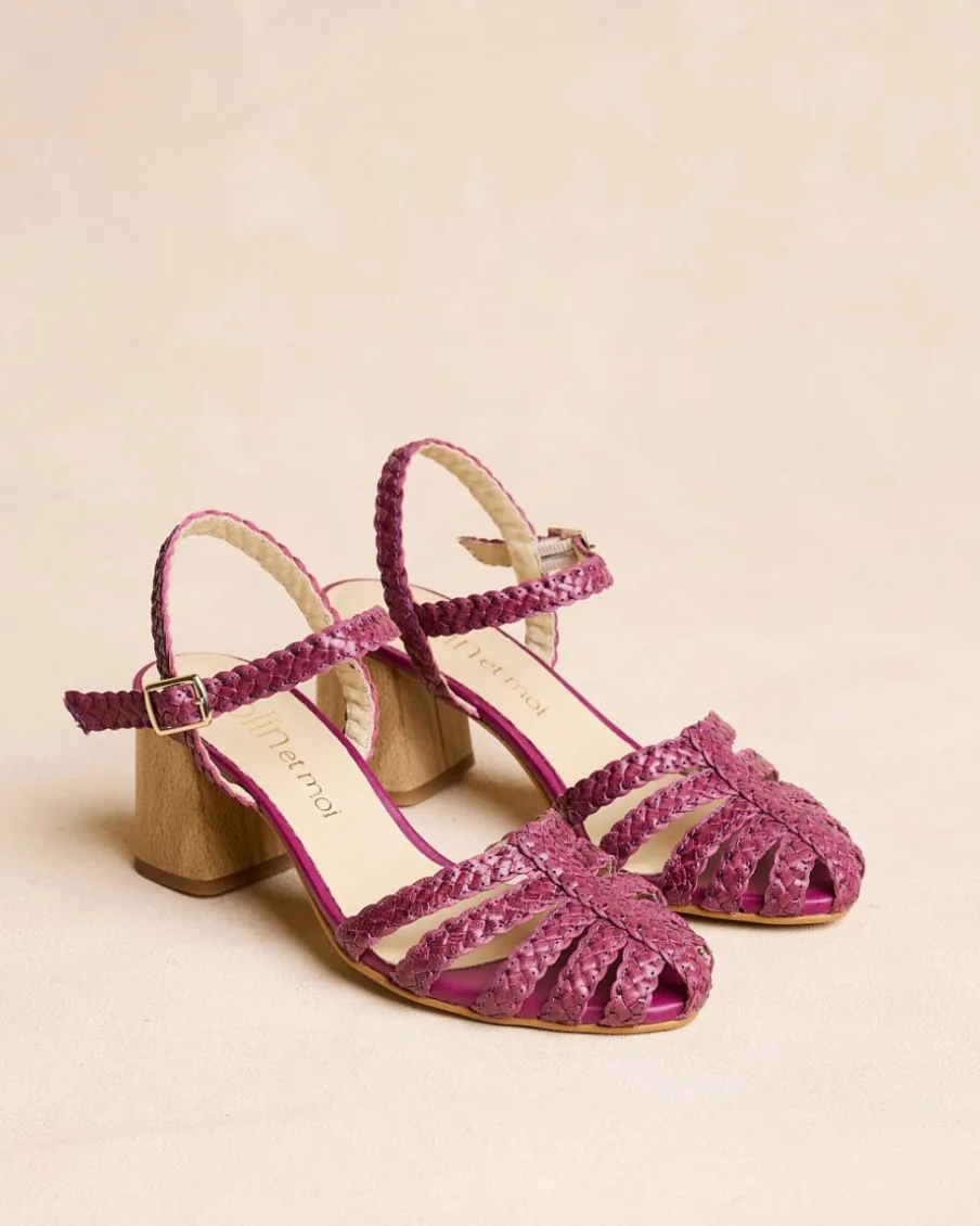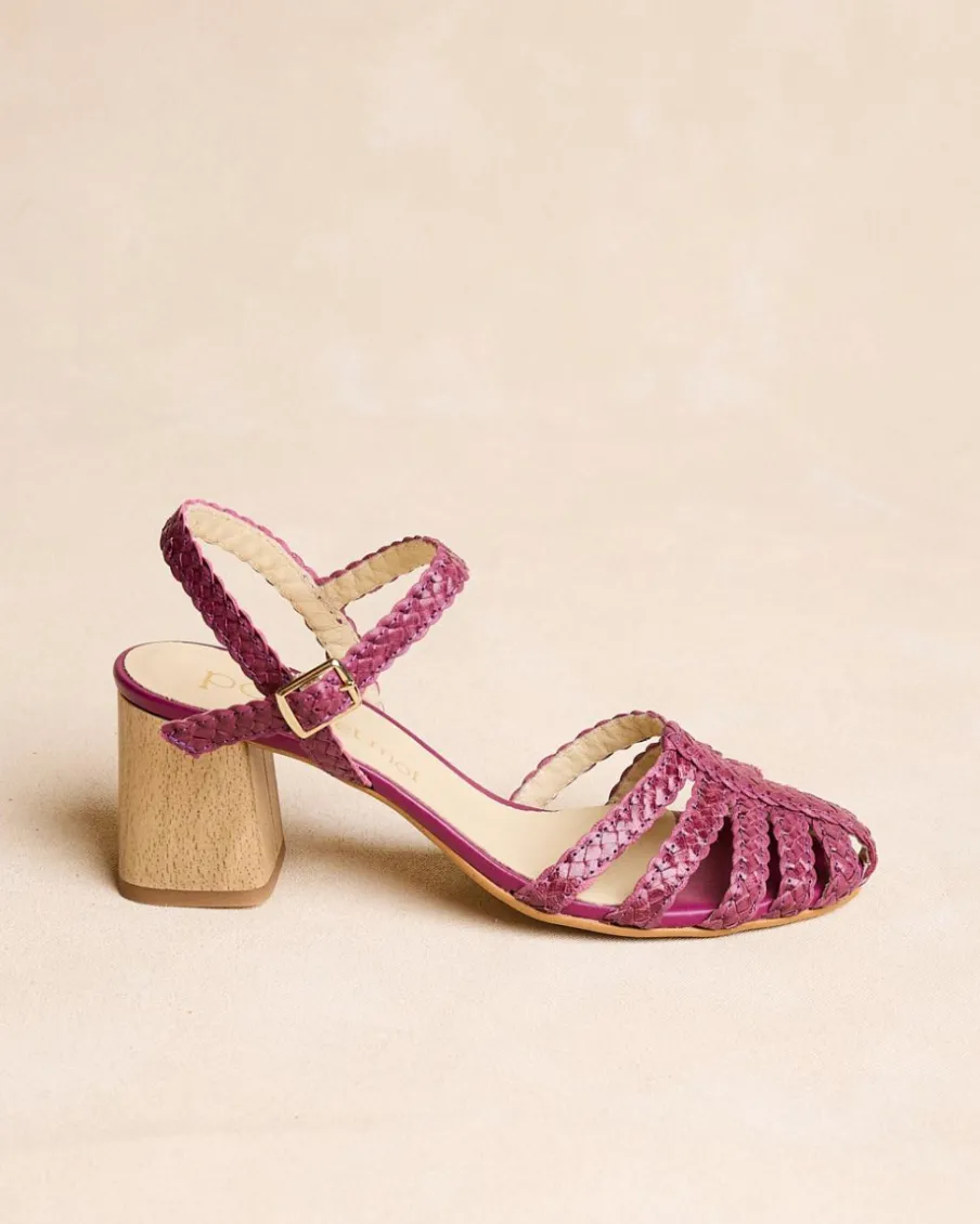Sandale en cuir tressé violet. Bout arrondi avec détail de ruban tressé croisé. Talon fermé par une bride en cuir. Cheville avec rendez-vous avec boucle pour un meilleur ajustement. Talon carré en bois. Une sandale très spéciale et élégante pour cette saison.