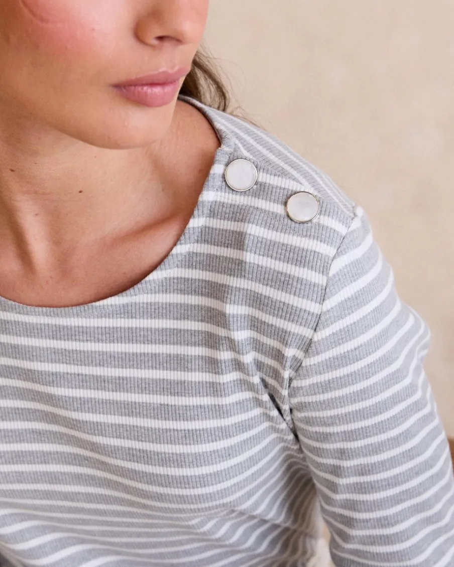 Haut gris à manches longues rayé blanc et gris avec bouton sur l’épaule, parfait pour un look confortable et polyvalent.