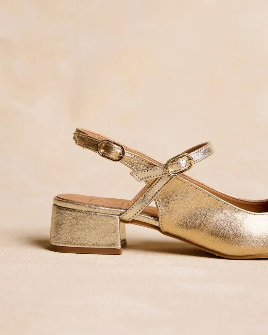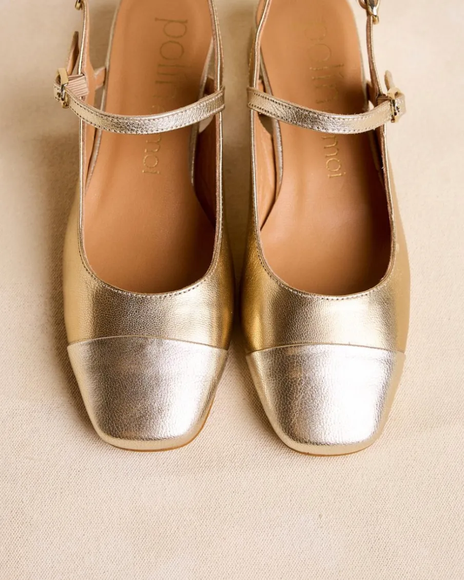 Escarpins dorés Mary Jane. Fermeture par sangle réglable avec boucles. Bout légèrement carré. Encolure arrondie. Une chaussure stylée et élégante pour un usage quotidien.