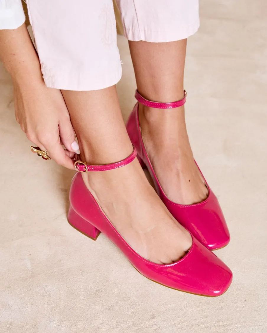 Mary Jane en framboise. Pointe pointue légèrement arrondie. Encolure fermée. Fermeture de la cheville par sangle réglable avec boucle carrée. Talon large. Une chaussure très féminine et confortable.
