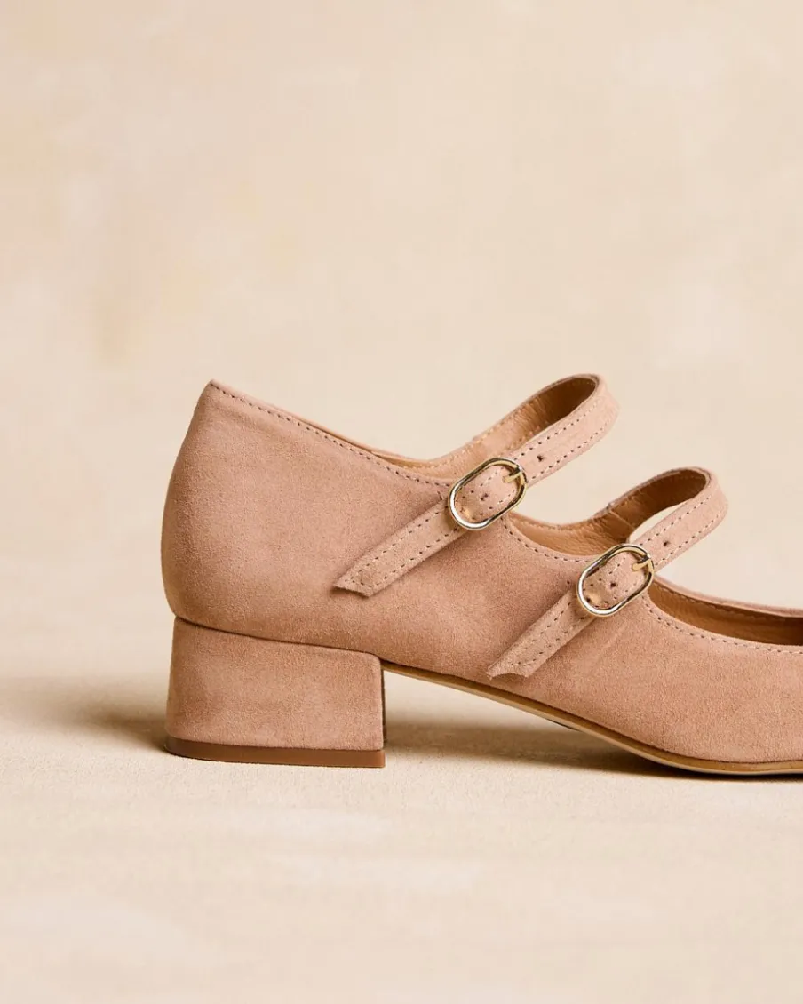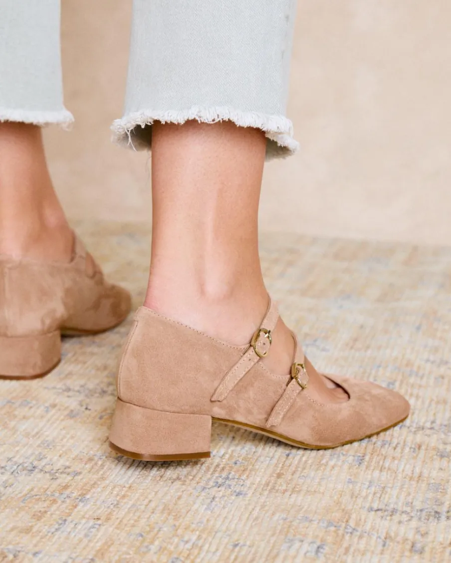 Ballerines en cuir velours de couleur nude. Fermeture par double sangle réglable avec boucles. Bout légèrement carré. Encolure arrondie. Un ballerines élégant et confortable à porter au quotidien.