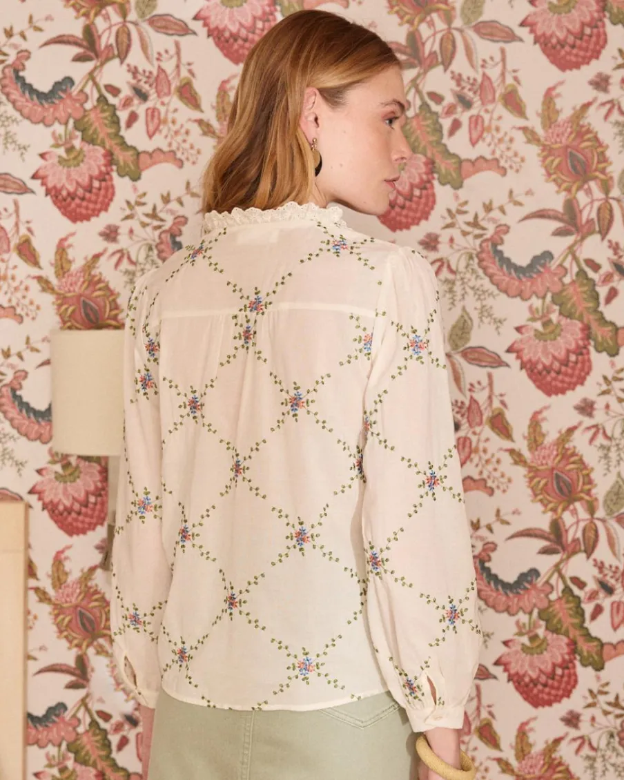 Blouse écrue imprimer ton vert, col à volants subtils, encolure en V et manches longues.