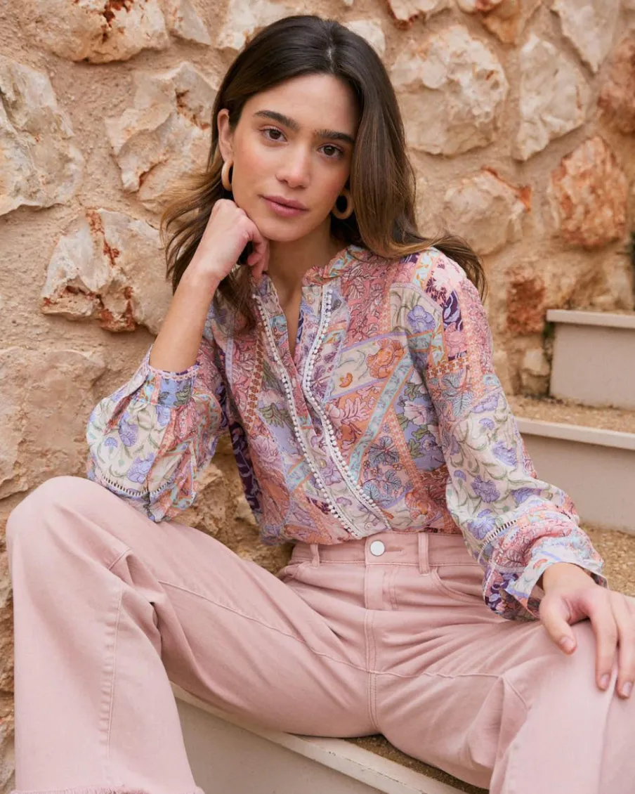 Chemisier imprimé avec un motif imprimer dans des tons pastel tels que le rose, le lilas et la pêche. Il a des détails en dentelle sur le devant et les manches, avec un col rond et une légère ouverture avec des boutons.