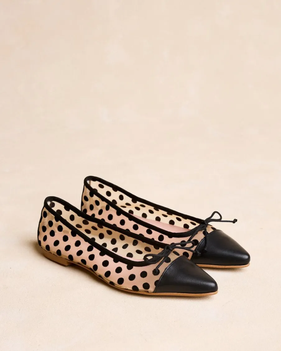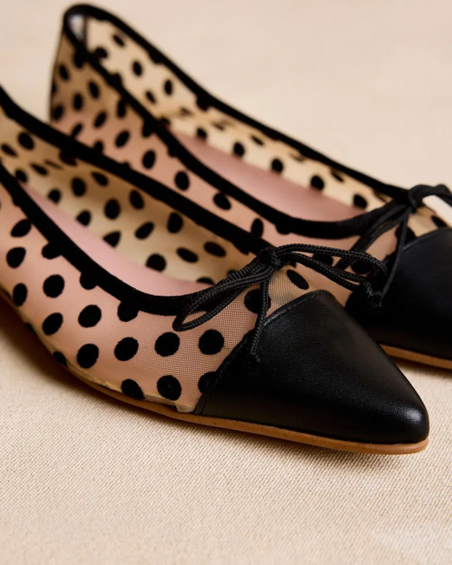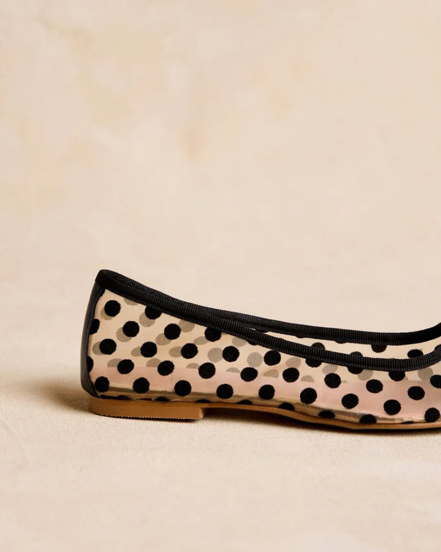 Ballerines noir avec un motif en maille transparente et des pois contrastés. Il est doté d’une pointe pointue avec une finition en cuir noir et d’un délicat nœud décoratif sur le devant. Sa semelle plate et sa structure légère la rendent idéale pour un look sophistiqué et confortable au quotidien.