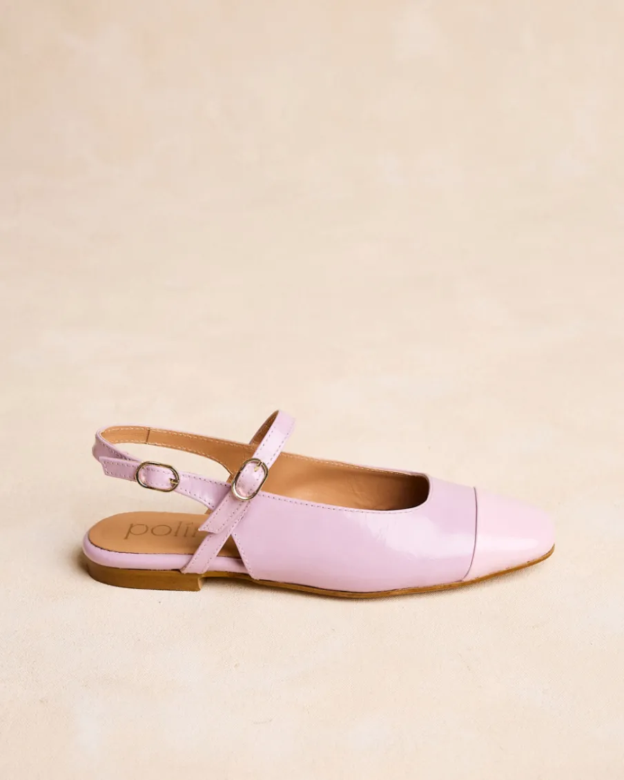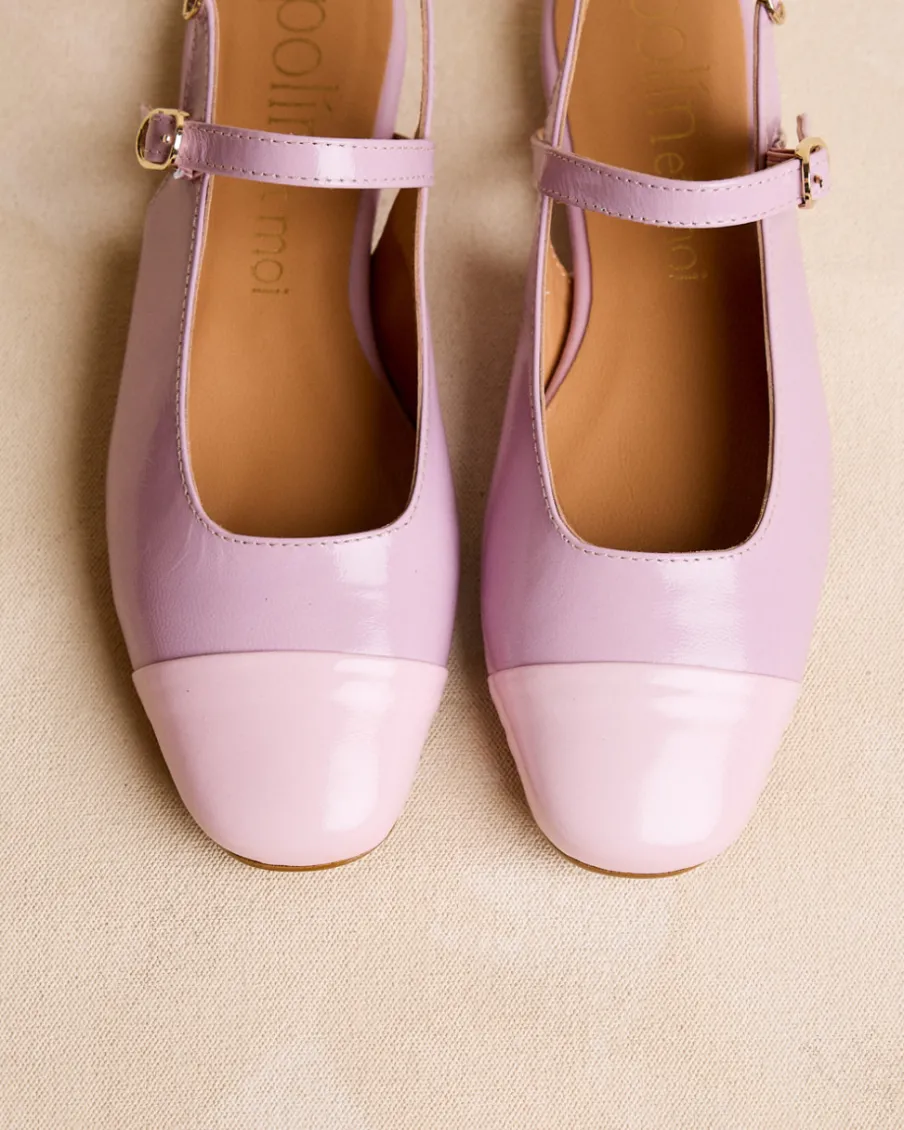 Ballerines escarpins arrière de couleur lilas. Fermeture à lanière réglable avec boucles. Orteil légèrement en à bout contrasté. Encolure arrondie. Une chaussure élégante et confortable à porter au quotidien.