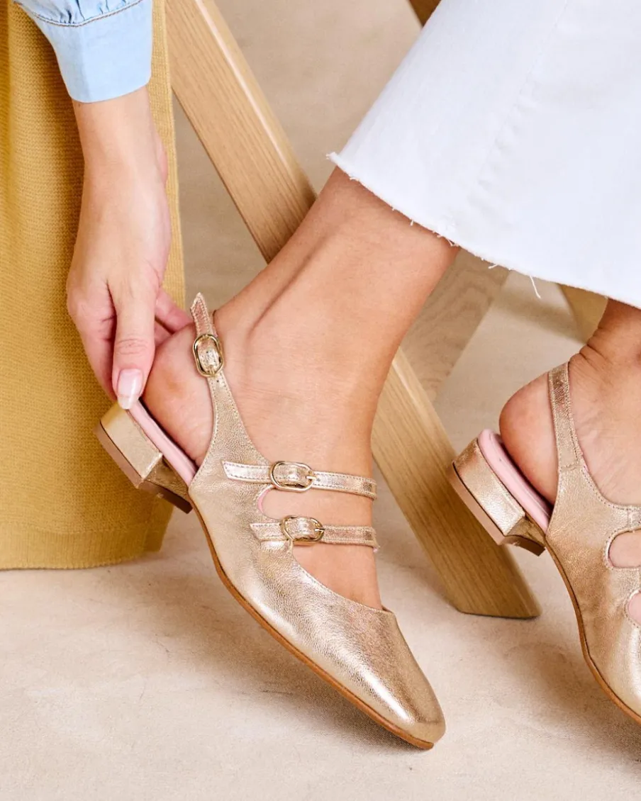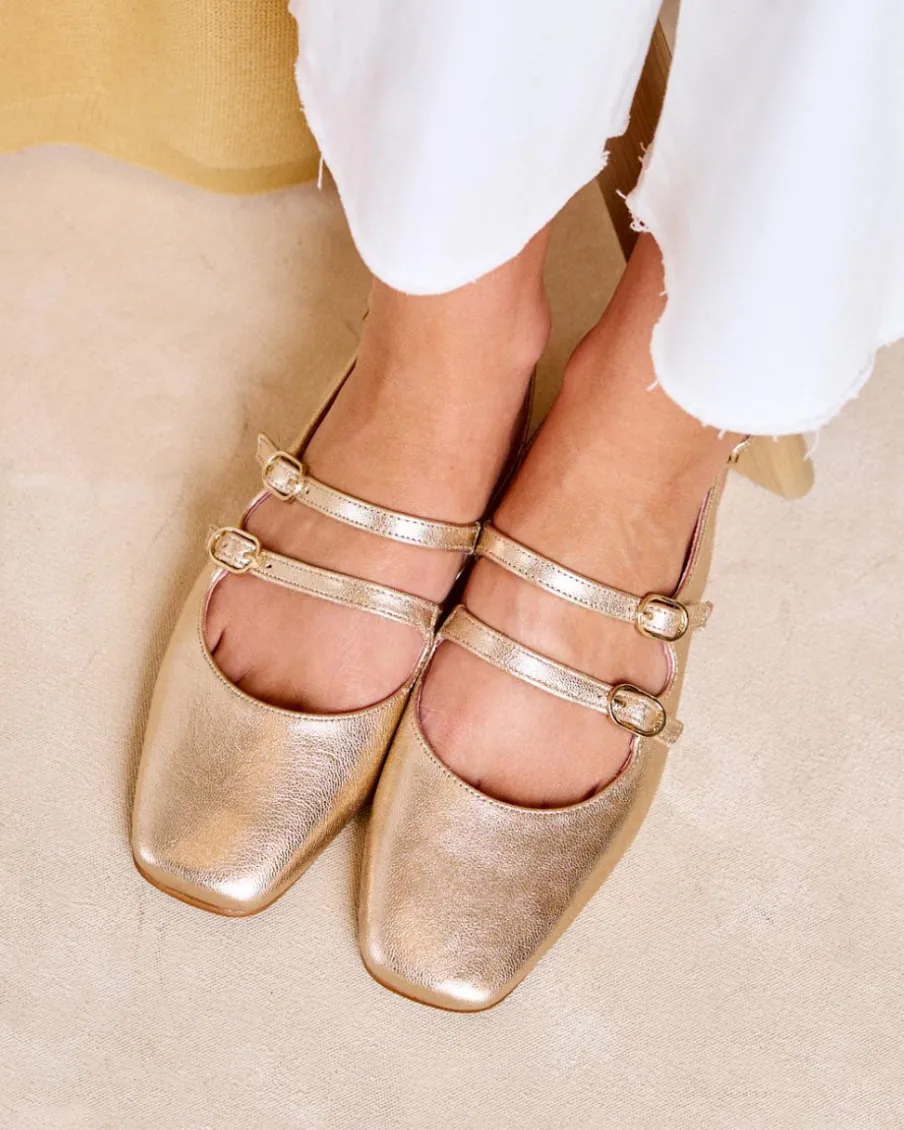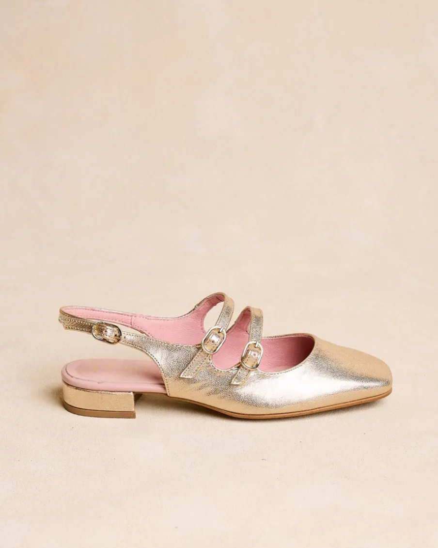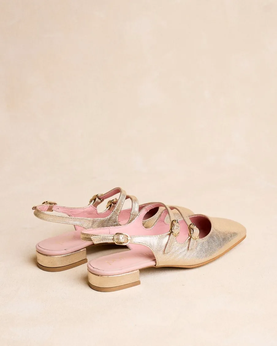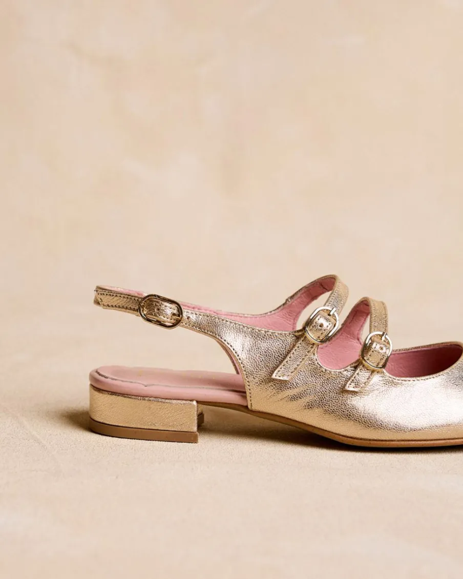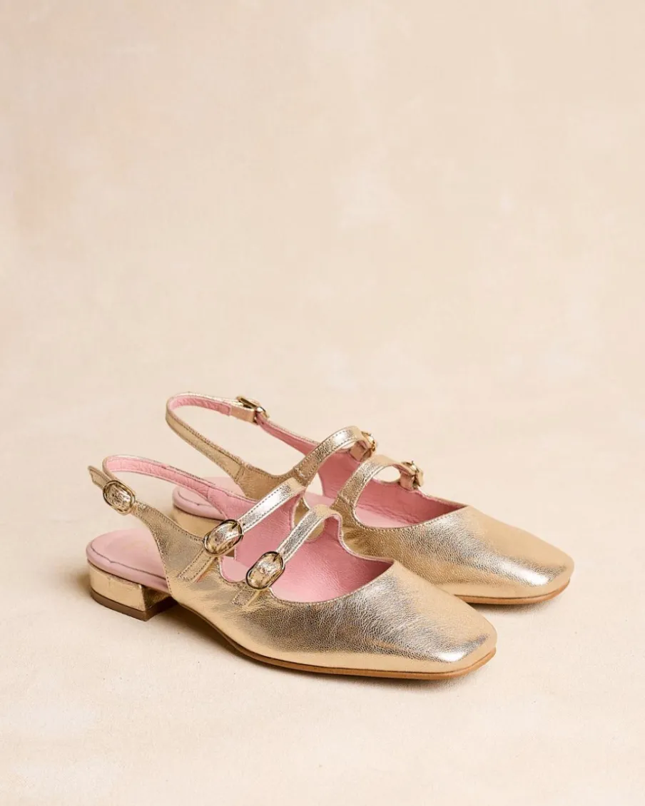 Escarpins dorés Mary Jane. Fermeture à double à lanière réglable avec boucles. Bout légèrement carré. Encolure arrondie. Une chaussure stylée et élégante pour un usage quotidien.