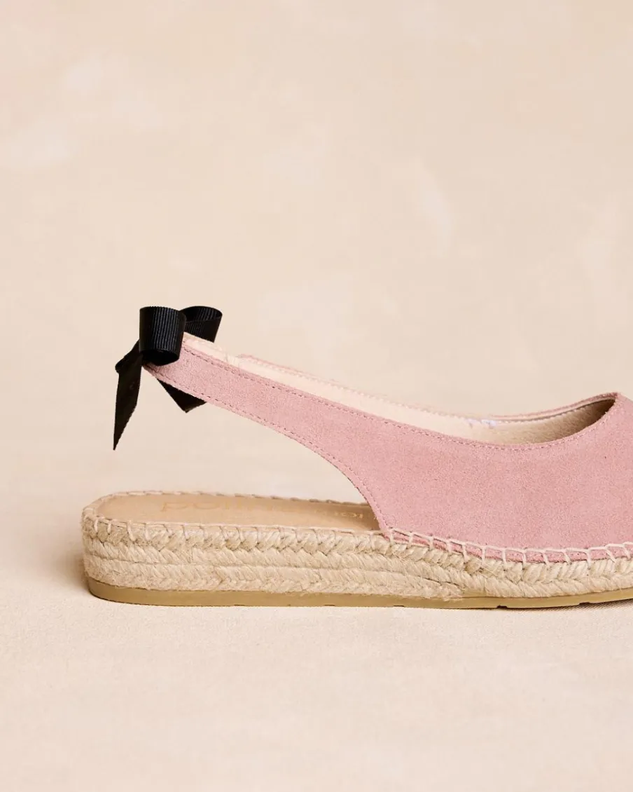 Espadrilles à bride arrière de couleur maquillage. Design simple mais sophistiqué, avec un talon ouvert et un nœud noir qui ajoute du contraste.