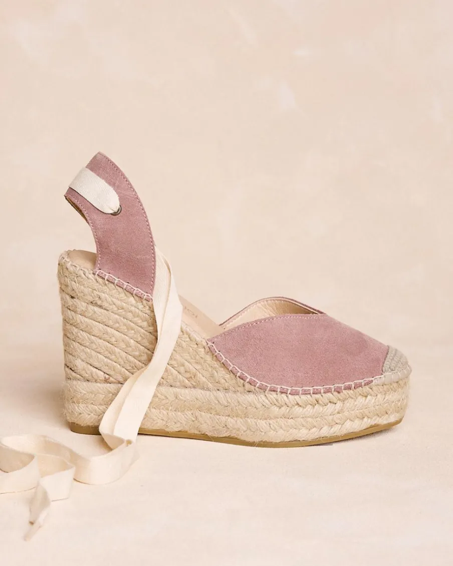 Espadrille en cuir à bride arrière de couleur taupe, encolure en cœur sur le devant, fermeture par bracelet croisé et boucle à la cheville. Fabrication espagnole de jute naturel.