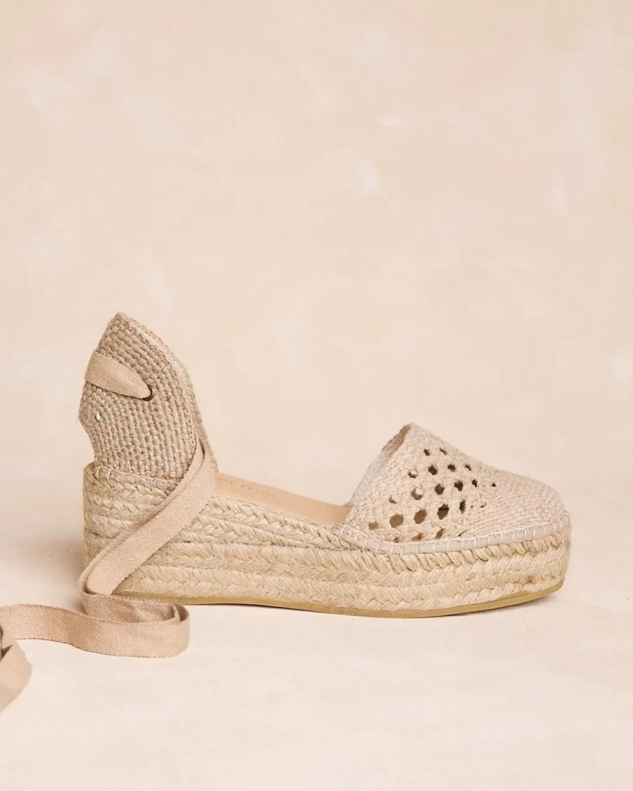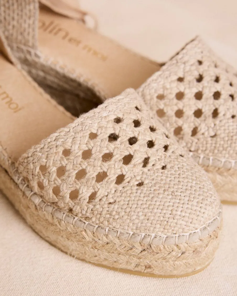 Espadrilles de couleur brute avec motif perforé et lien à la cheville. Style bohème, frais et féminin.