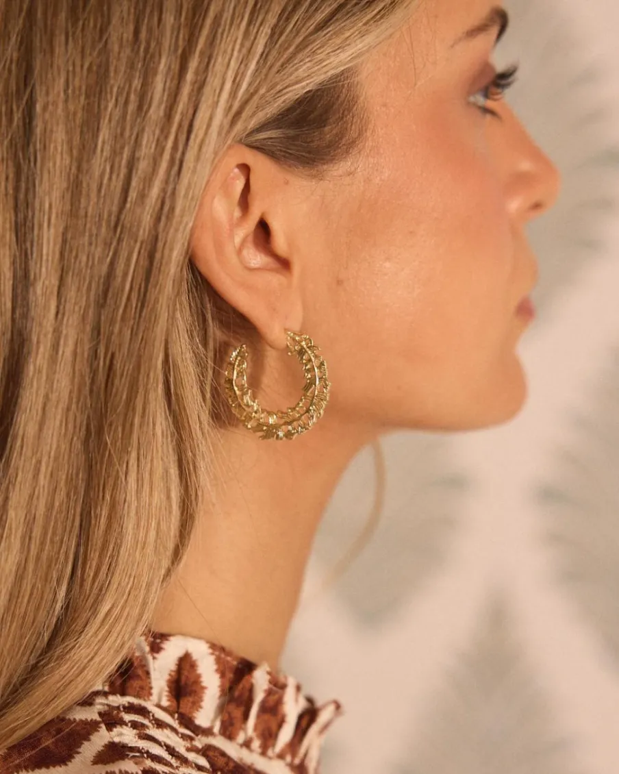 Boucles d’oreilles créoles en or avec détails de feuilles.