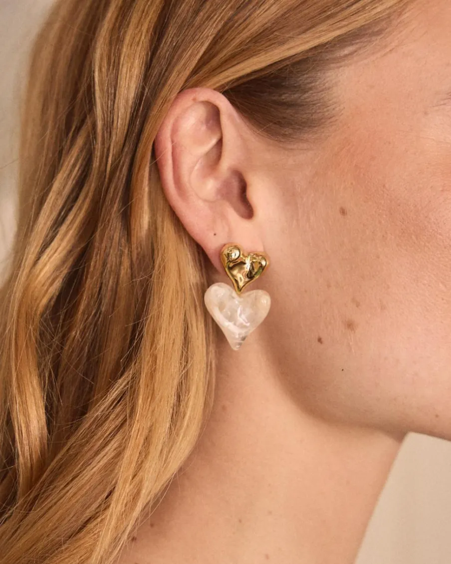 Boucles d’oreilles avec un cœur doré et un pendentif blanc en forme de cœur.