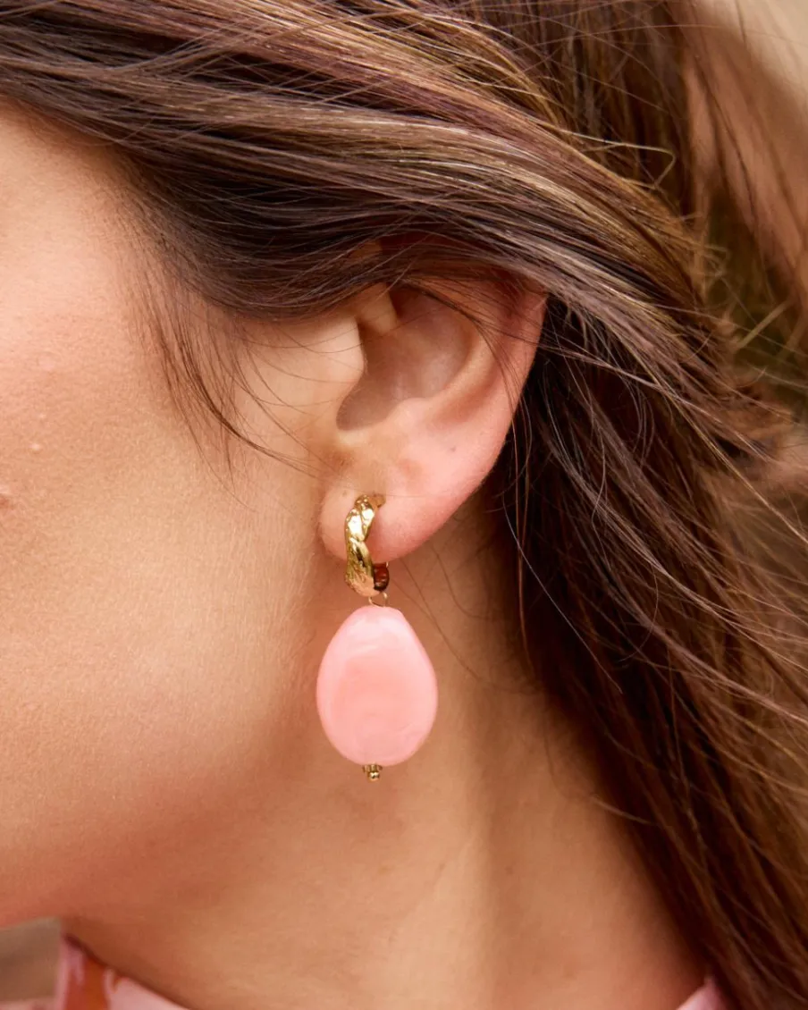 Boucle d’oreille dorée avec détail de suspension corail.