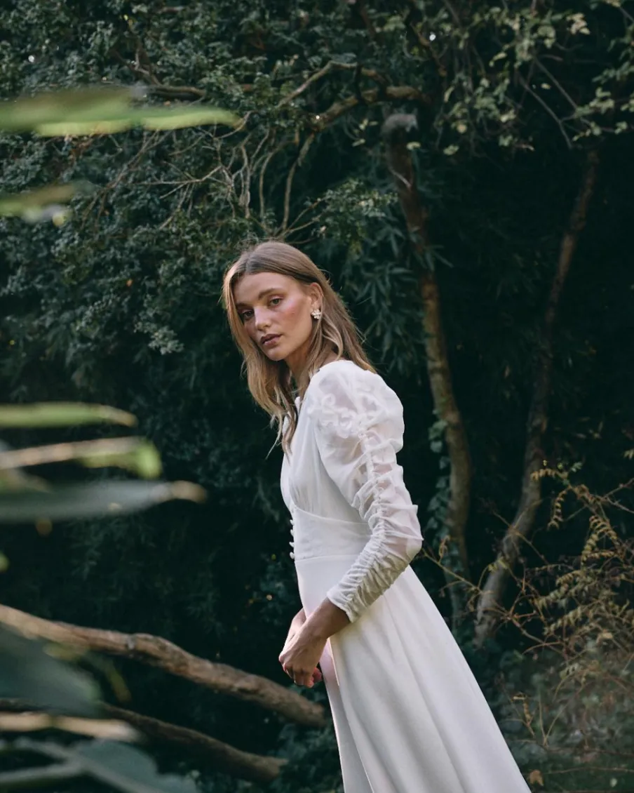 La délicatesse et le charme d’une longue robe blanche en tissu léger. Décolleté en V profond agrémenté de boutons subtils sous la poitrine, créant une silhouette féminine. Manches longues bouffantes. La jupe fluide tombe doucement, transformant chaque pas en un mouvement élégant. Ce design capture l’essence de la mariée romantique et rêveuse.