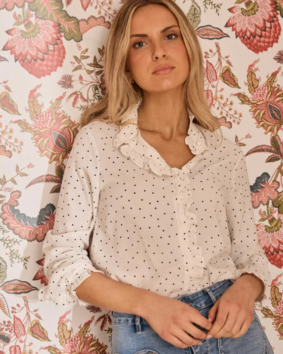 Blouse écrue à pois noirs avec rangée de boutons et détail à volants. Manches longues. Un chemisier idéal à combiner dans la vie de tous les jours.