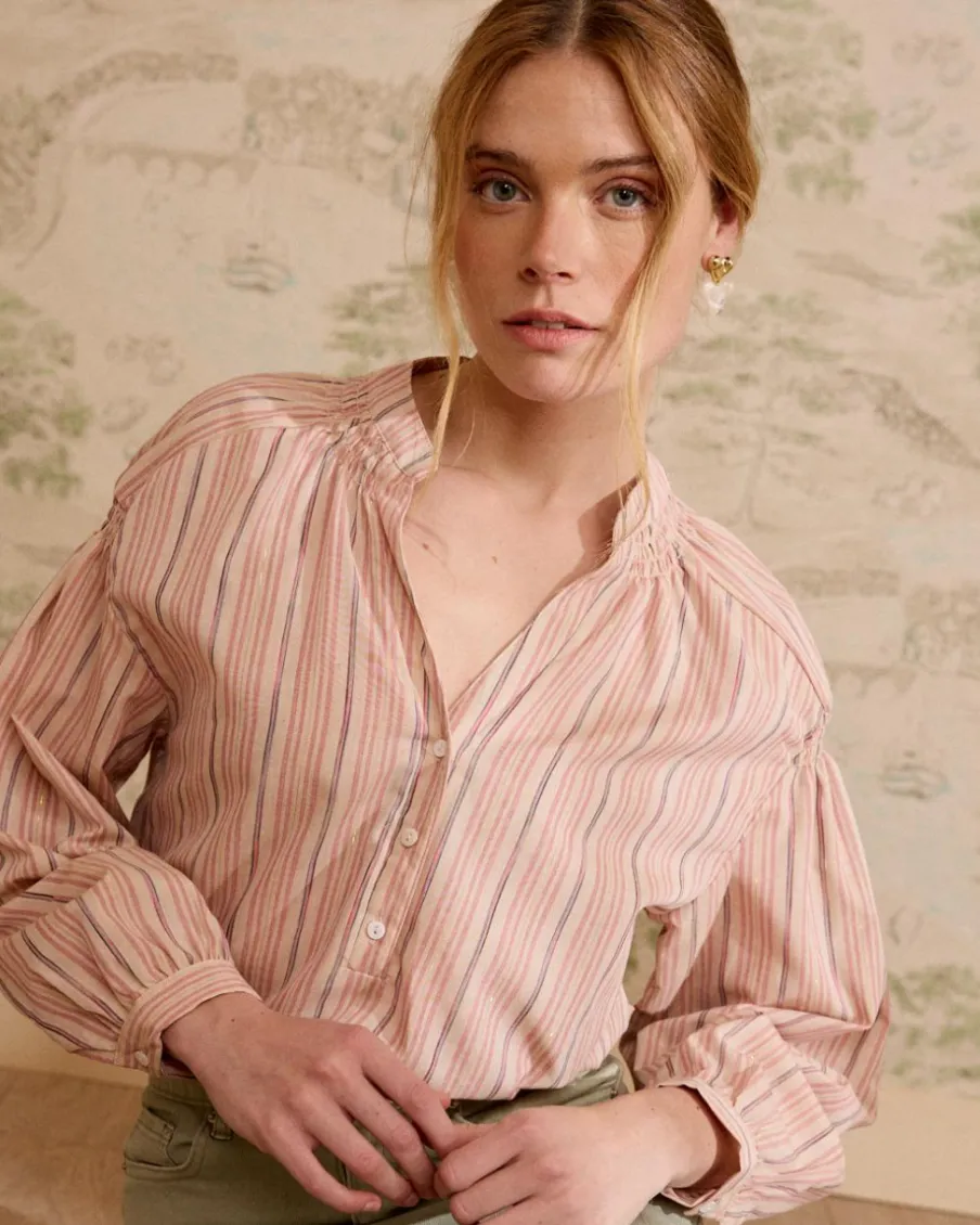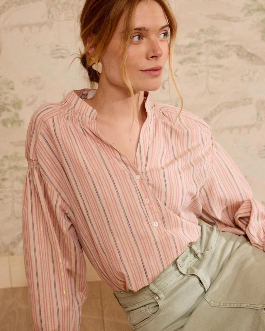 Blouse rose avec rayures en lurex multicolores, rangée de boutons, encolure en V et manches longues