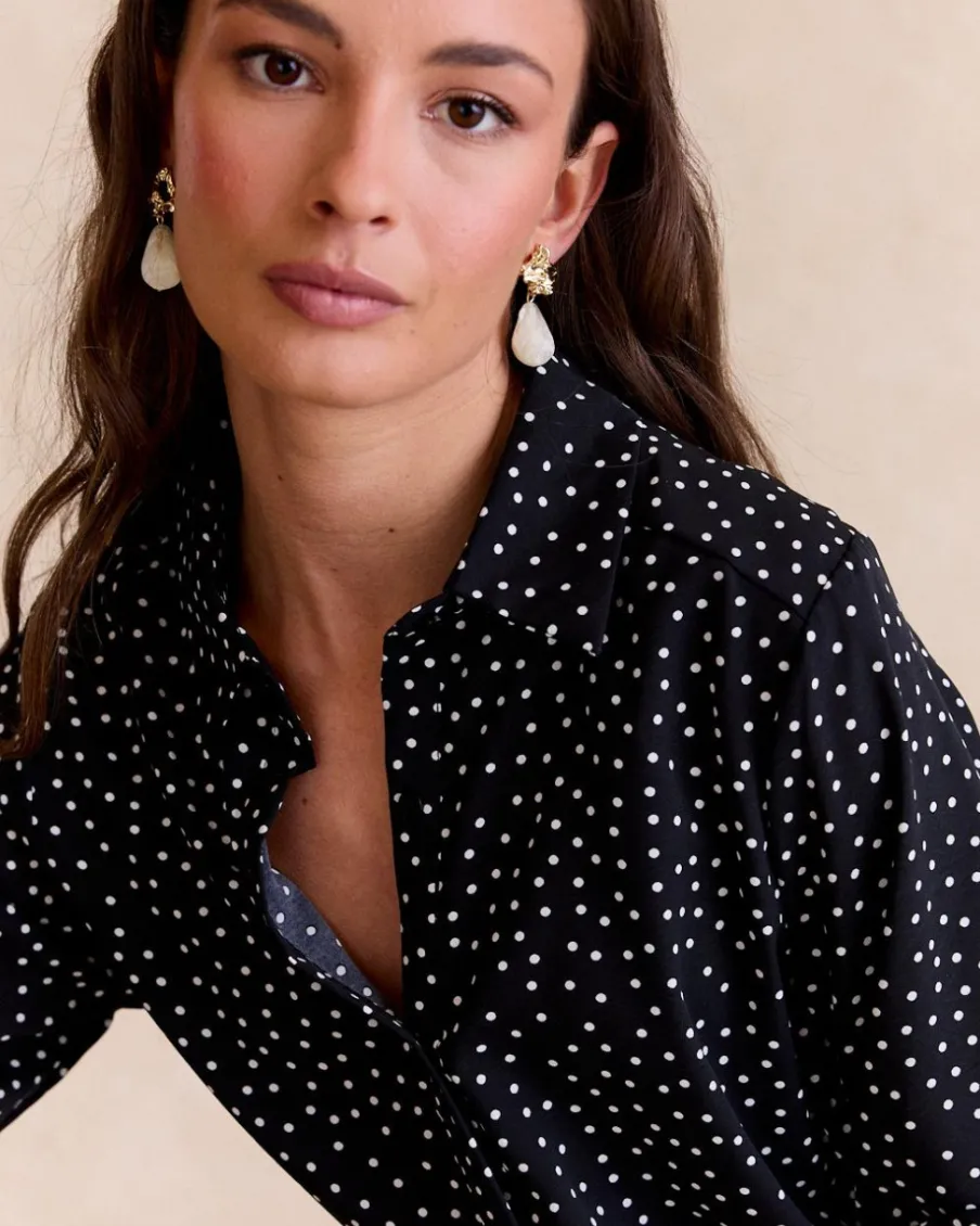 Blouse noire à pois écrus, un basique élégant et facile à associer.
