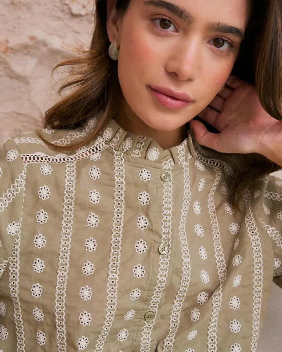 Blouse de couleur pistache avec broderies contrastées et détails ajourés. Son design à manches longues et son col subtilement froncé apportent un air élégant et frais, idéal pour des looks polyvalents.