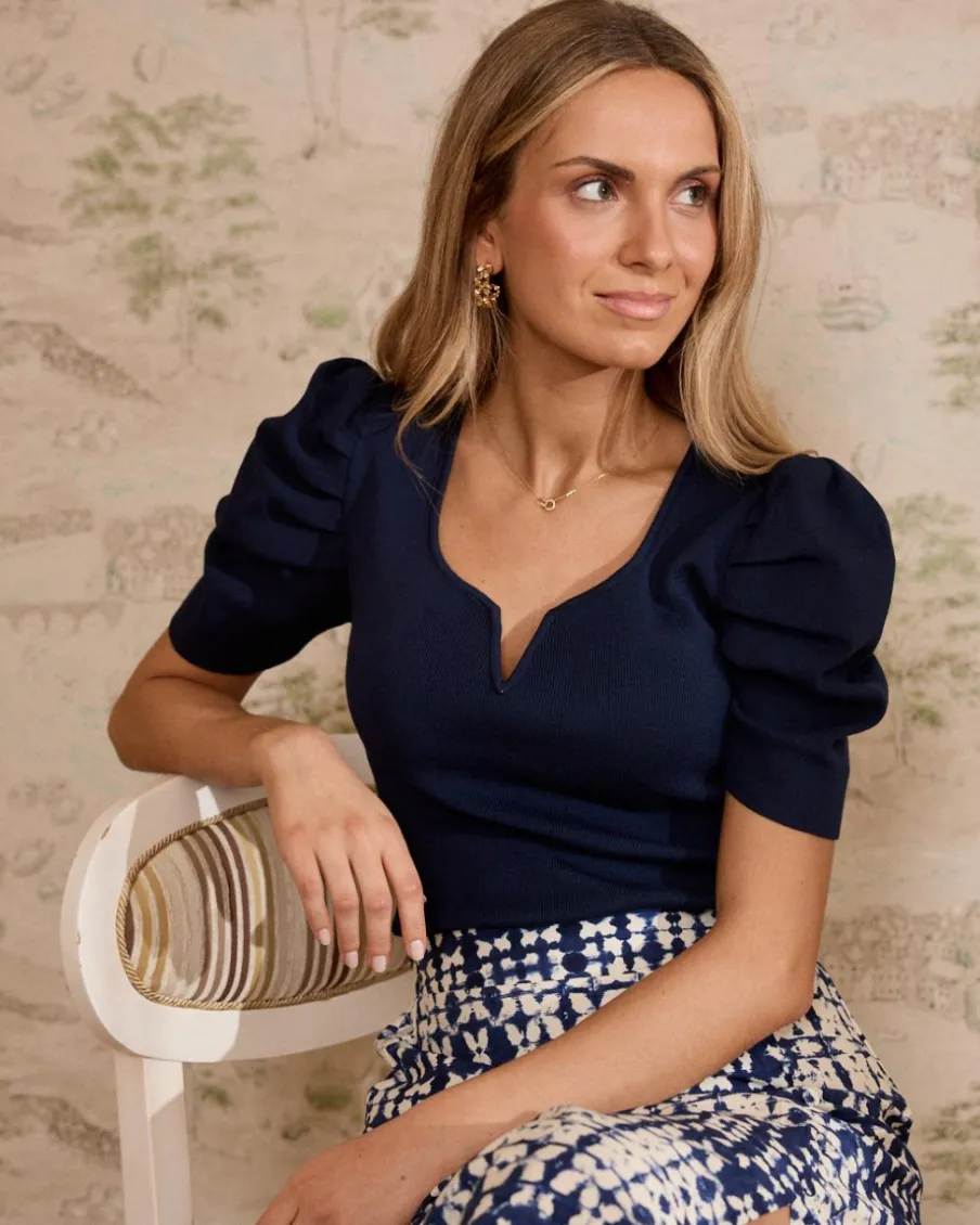 Haut en maille bleue, encolure en V et manches bouffantes.