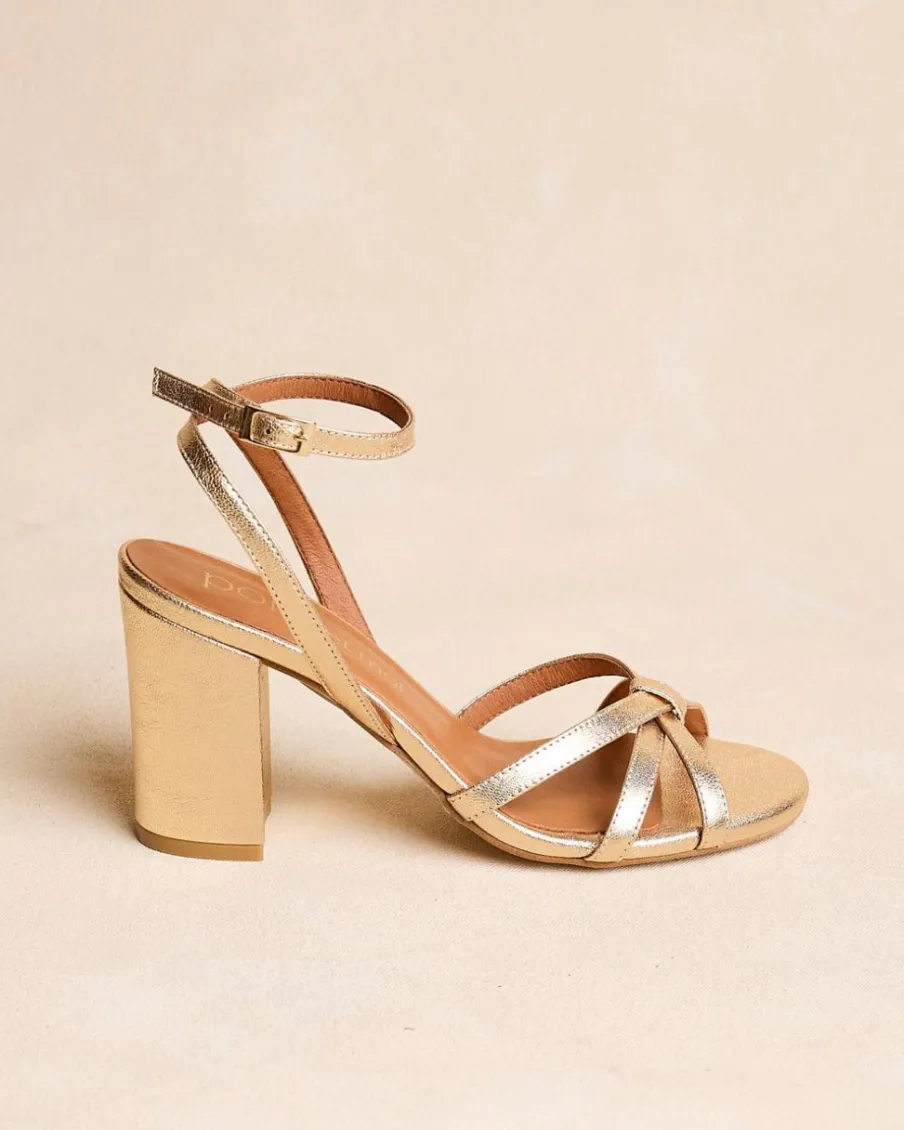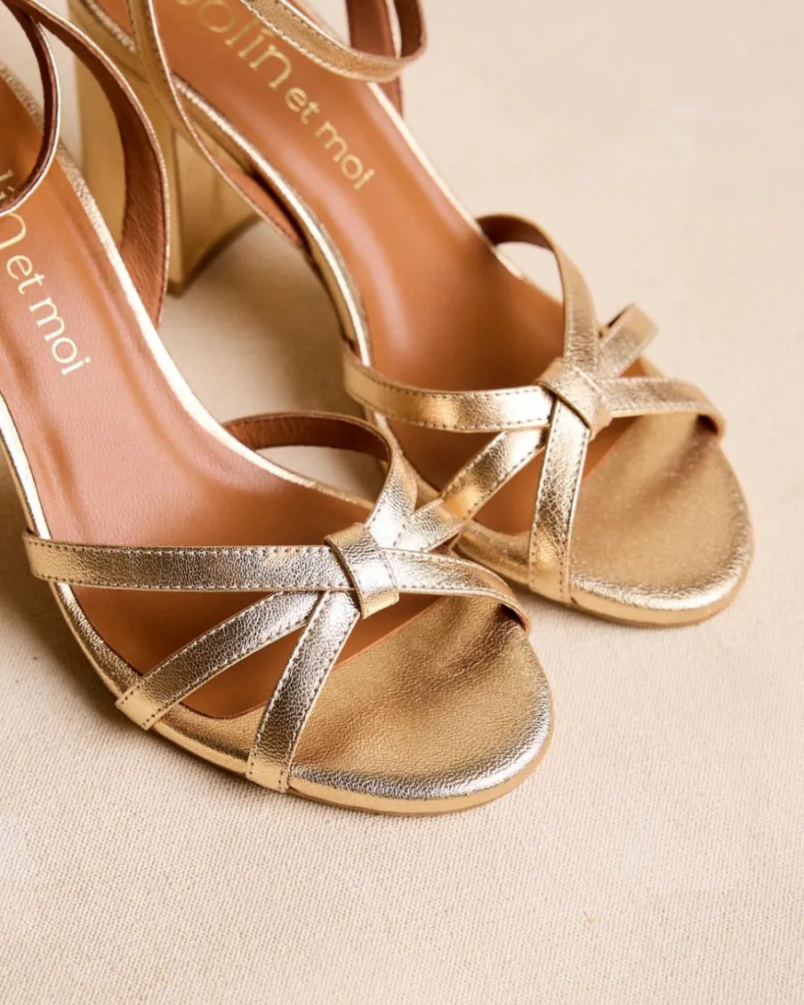Sandale à talons dorés. Pointe carrée aux coins légèrement arrondis. Encolure avec trois rubans croisés. Fermeture de la cheville par sangle réglable avec boucle carrée. Une chaussure élégante et confortable.