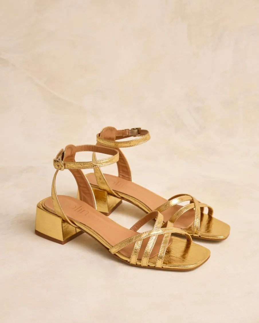 Sandale en cuir métallisé de couleur or. Bout légèrement carré. Bretelles croisées sur le cou-de-pied. Fermeture de la cheville avec bride ton sur ton et boucle pour ajuster la sandale à la cheville. Petit talon carré. Une sandale élégante et confortable.