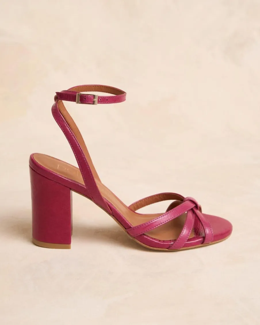 Sandale à talons de couleur bougainvillière avec plusieurs rubans qui se croisent en formant un nœud au centre. Pointe arrondie. Fermeture de la cheville par sangle réglable avec boucle carrée. Talon large pour plus de confort. Une chaussure très féminine et élégante pour le evénements de cette saison.