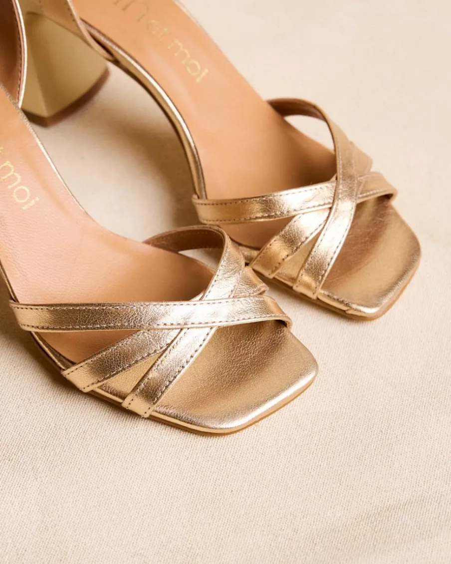 Sandale à talons dorés. Pointe carrée aux coins légèrement arrondis. Encolure avec trois rubans croisés. Fermeture de la cheville par sangle réglable avec boucle carrée. Une chaussure élégante et confortable.