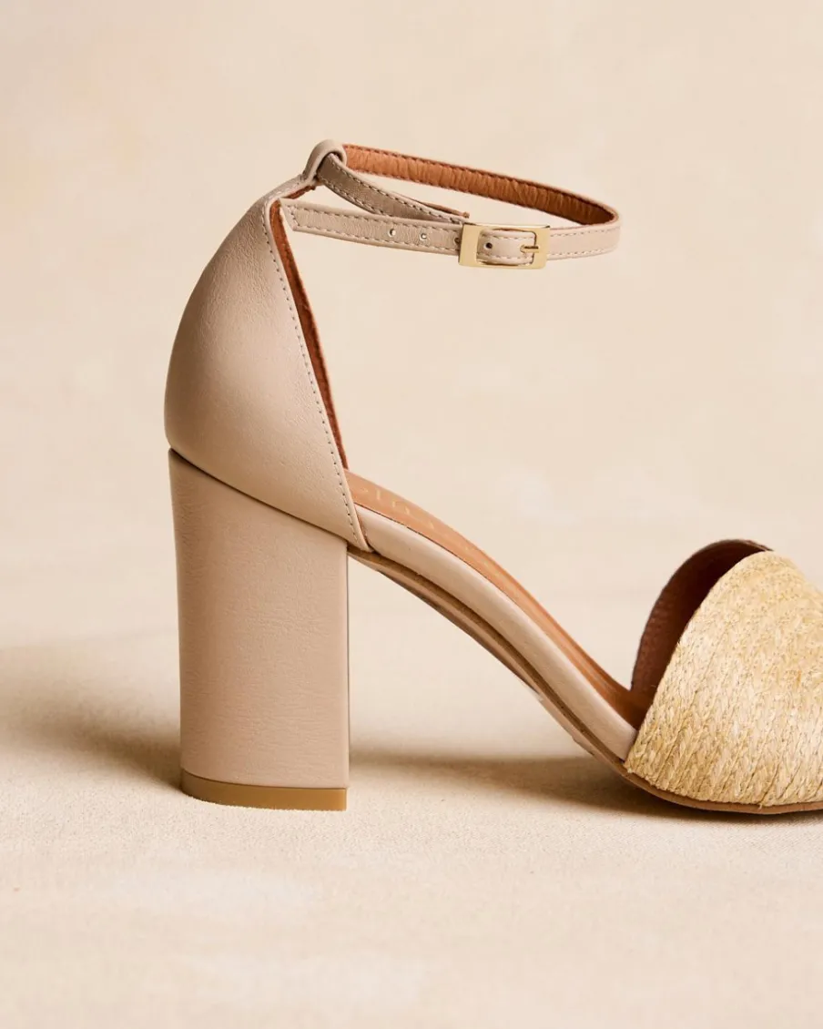 Sandale à talon en raphia beige, un design élégant et polyvalent pour toutes les occasions. Il est doté d’une fermeture à boucle métallique pour un ajustement sûr et confortable.