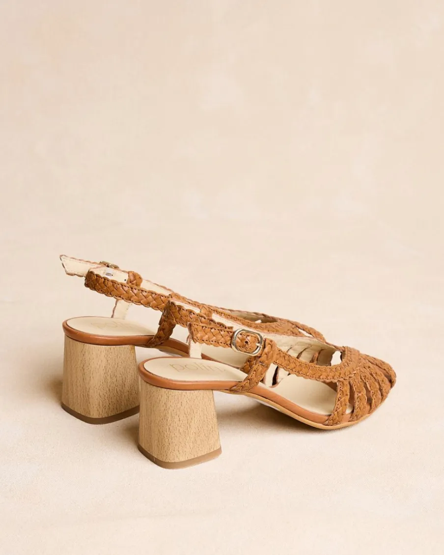Sandale en cuir tressé de couleur cuir. Bout arrondi avec détail de ruban tressé croisé. Talon fermé par une bride en cuir avec boucle. Talon carré en bois. Une sandale très spéciale et élégante pour cette saison.