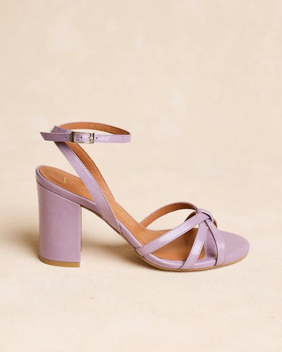 Sandale à talon lilas. Pointe carrée aux coins légèrement arrondis. Encolure avec trois rubans croisés. Fermeture de la cheville par sangle réglable avec boucle carrée. Une chaussure élégante et confortable.