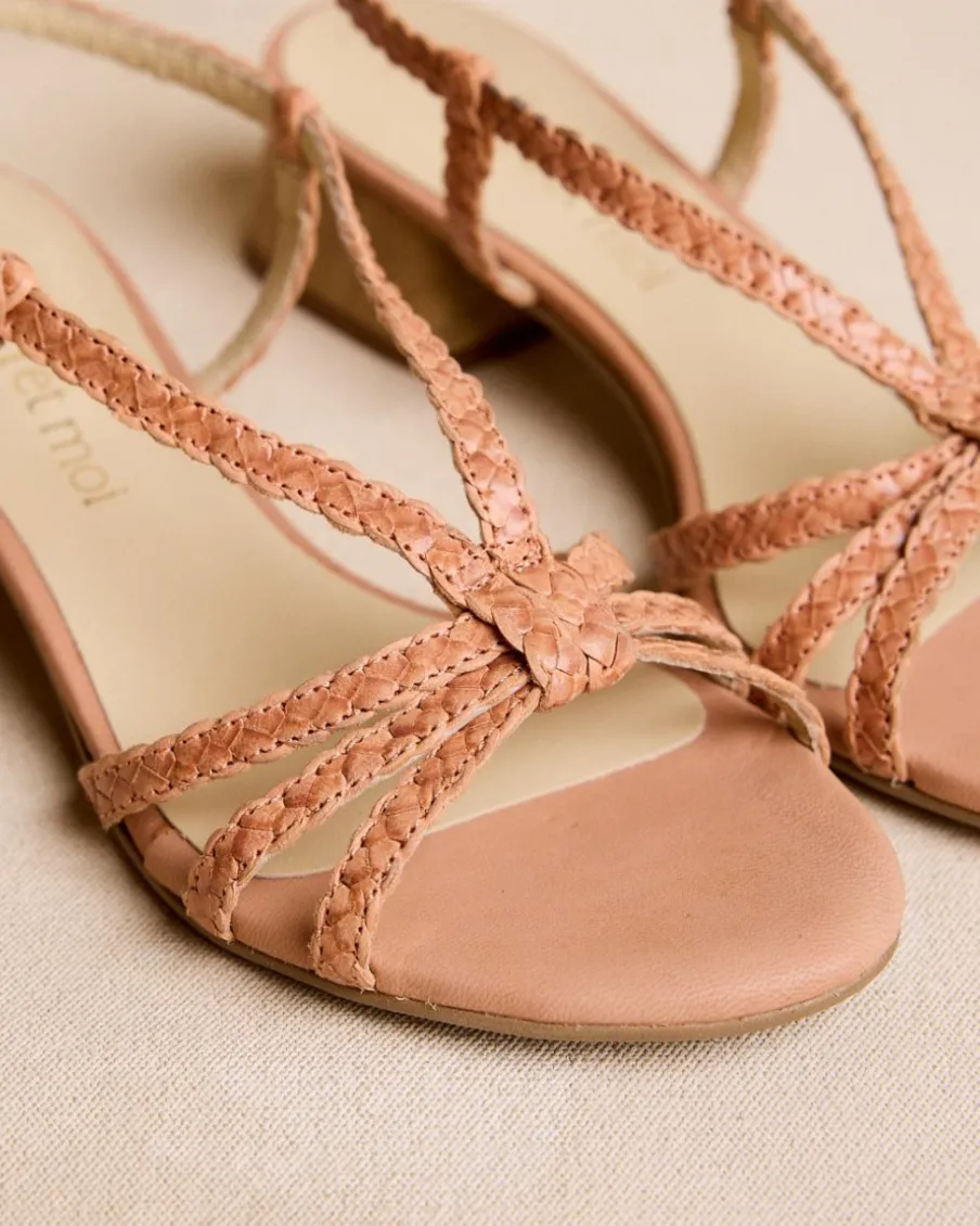 Sandale à talon tressé en cuir camel. Tige en ruban triple tressé avec détail de nœud au centre. Talon fermé par une bride en cuir avec boucle pour un meilleur ajustement. Petit talon carré effet bois. Une sandale confortable et très polyvalente à porter au quotidien.