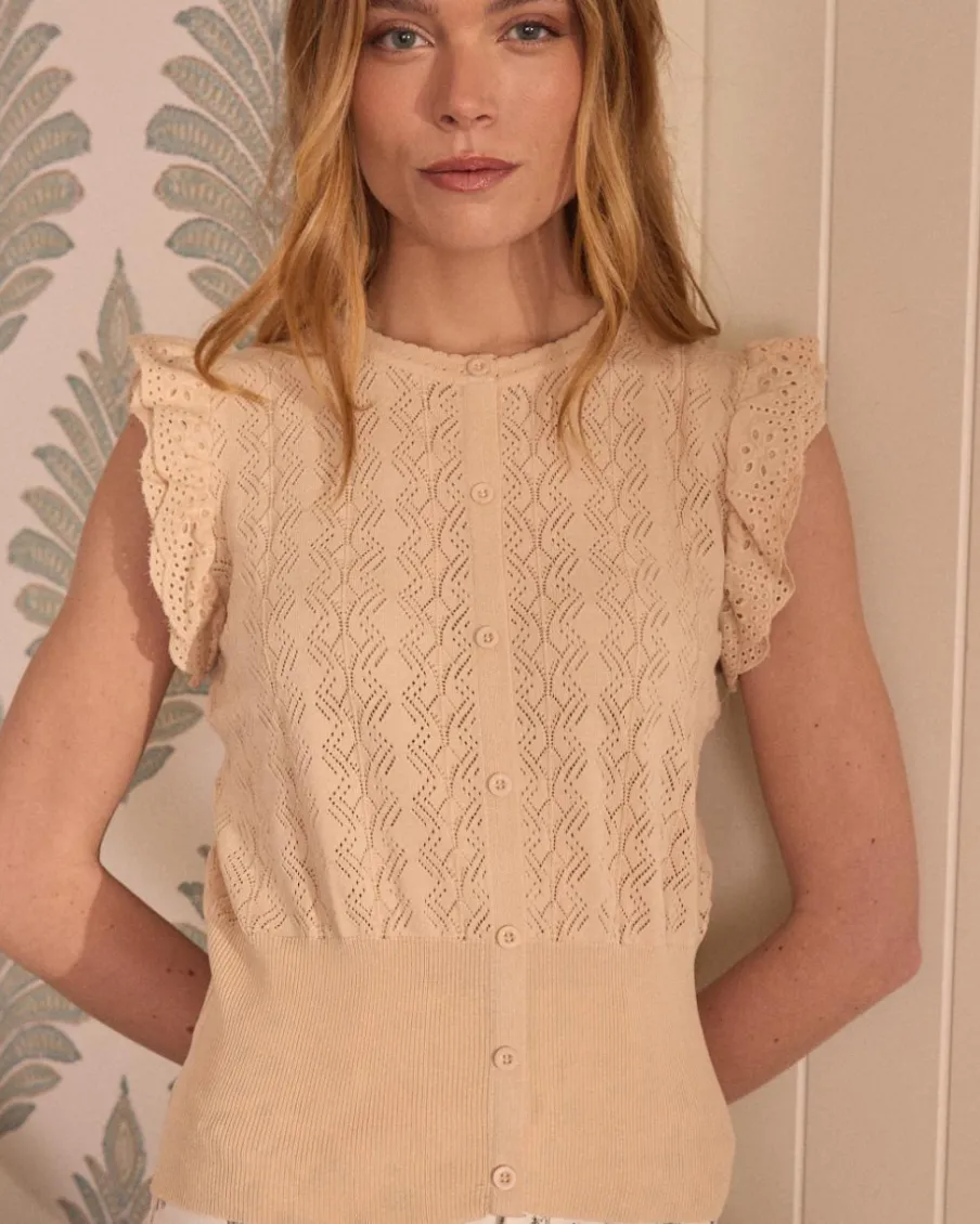 Haut beige à texture ajourée, manches courtes à volants et détail élastique à la taille.