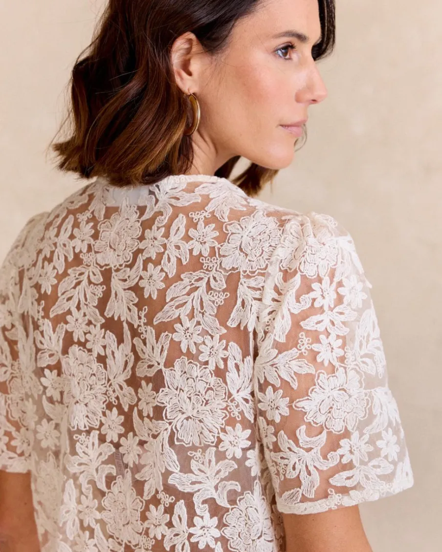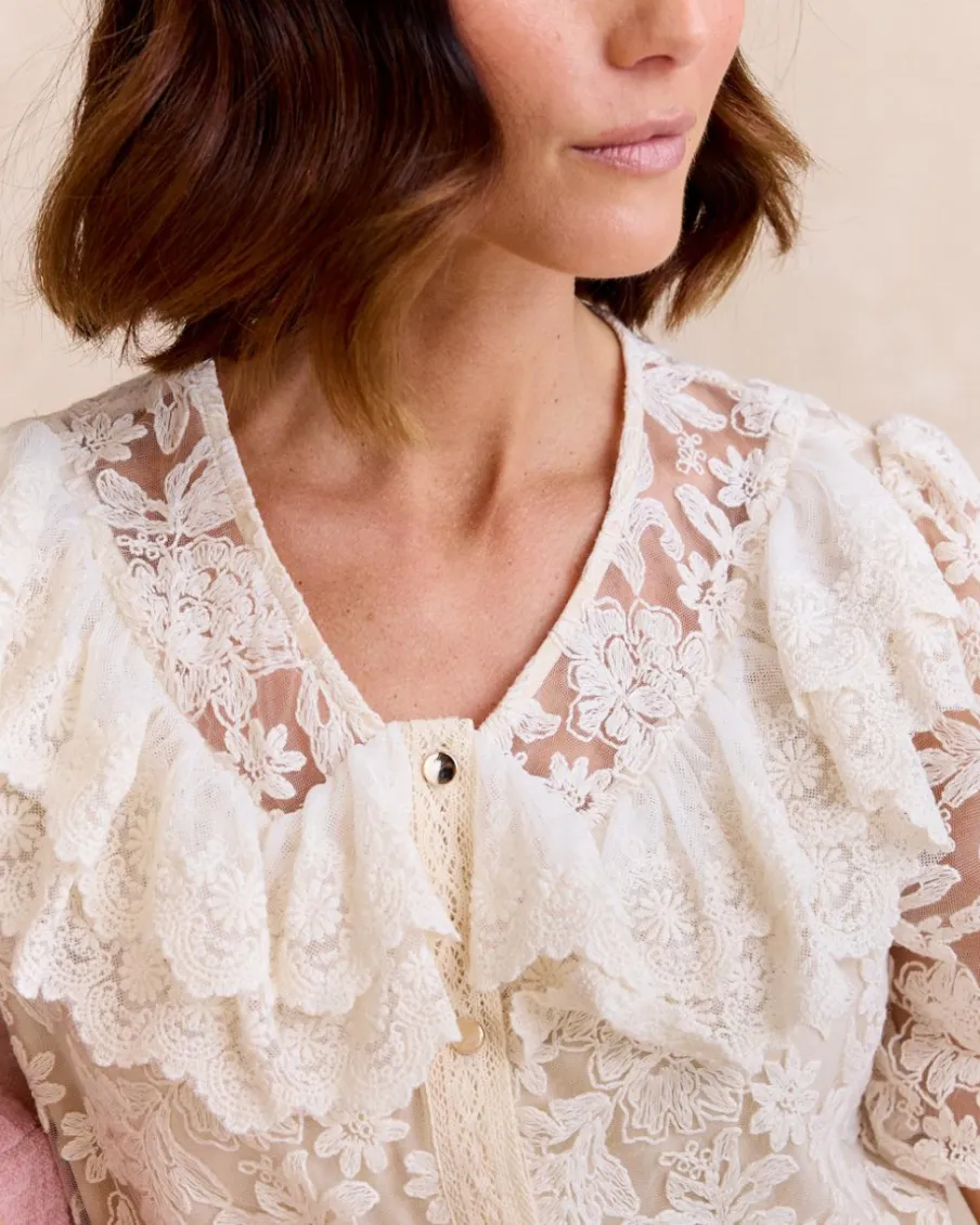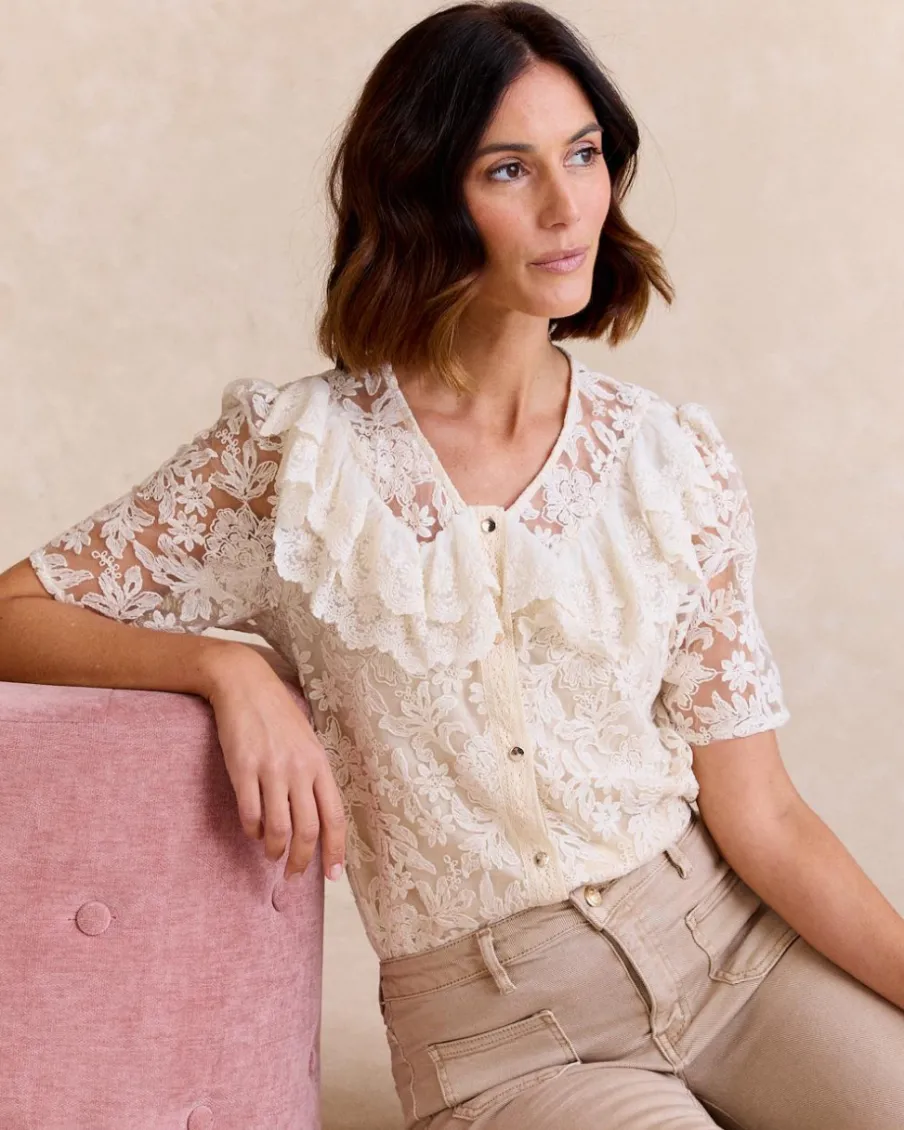Top écru en dentelle florale délicate avec volants sur le devant, parfait pour les occasions spéciales, les looks décontractés ou les evénements formels.